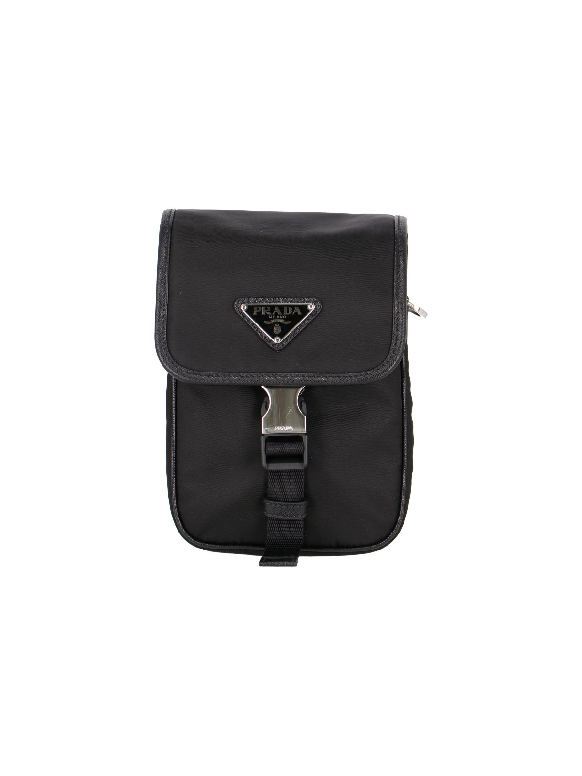 PRADA BLACK NYLON SHOULDER BAG WITH SAFFIANO LEATHER DETAILS, ADJUSTABLE AND REMOVABLE SHOULDER STRAP, MINI POUCH REMOVABLE SHOULDER STRAP DETAIL, METAL BUCKLE CLOSURE, ENAMELED METAL TRIANGLE LOGO, FLAT BACK POCKET, TWO MAIN INNER COMPARTMENTS. PRODUCT INFO PRODUCT CODE 2VD043 XOP 2DMHF0002 COMPOSITION: 100% POLYAMIDE SIZE AND FIT: H 19 X W 13.5 X D 6.5 CM MADE IN: ITALIA - TRIMS: 100% LEATHER