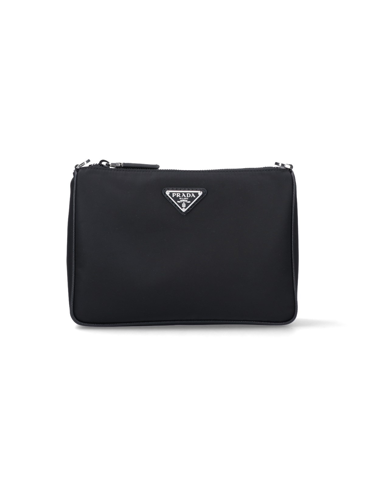 PRADA RE-NYLON AND SAFFIANO SHOULDER BAG, BLACK COLOR, ZIPPER CLOSURE, SILVER COLOR ENAMELED METAL TRIANGLE LOGO ON FRONT, ADJUSTABLE AND REMOVABLE SHOULDER STRAP, REMOVABLE POUCH DETAIL, SILVER COLOR ENAMELED METAL TRIANGLE LOGO ON FRONT, ONE INTERIOR COMPARTMENT. PRODUCT INFO PRODUCT CODE 2VH113 XOP 2DMHF0002 - 100% RECYCLED NYLON - DETAILS: 100% LEATHER - H 18.5 X W 24 X D 6 CM - MADE IN ITALY - 2VH113 XOP 2DMH-F0002 MADE IN: ITALY