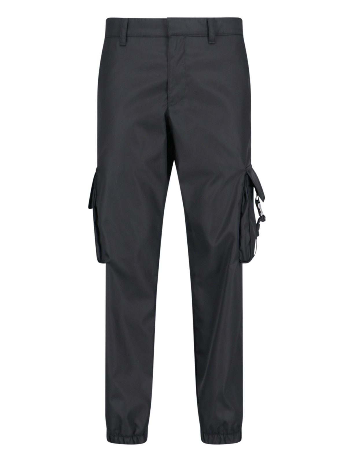PRADA RE-NYLON TROUSERS, BLACK COLOUR, HOOK AND ZIP FASTENING, BELT LOOPS, STRAIGHT LEG, CARGO POCKETS WITH FLAP AND METAL BUCKLE, ICONIC ENAMELLED TRIANGLE LOGO RIGHT SIDE, TWO PROFILED BACK POCKETS, ELASTICATED BOTTOM HEM. PRODUCT INFO PRODUCT CODE SPH130 211 1WQ8F0002 - 100% POLYAMIDE - SLIM FIT MADE IN: ITALY