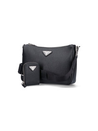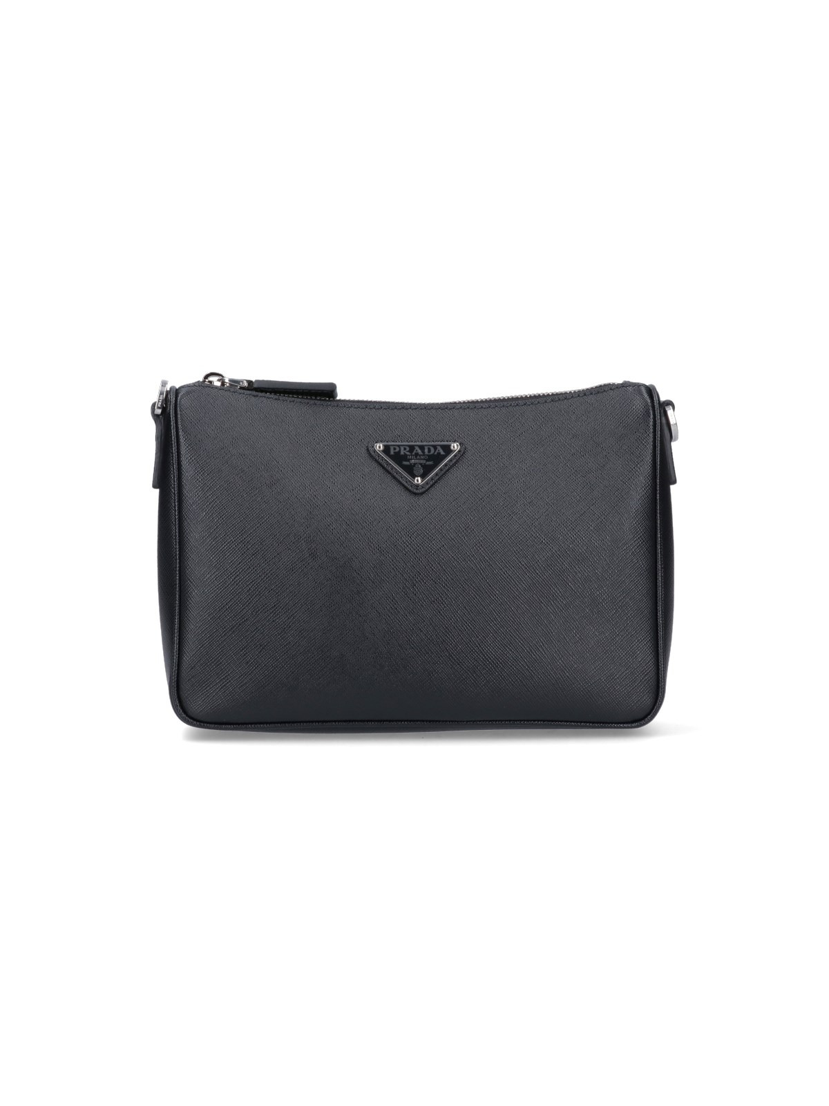 PRADA SAFFIANO SHOULDER BAG, BLACK LEATHER, ADJUSTABLE AND REMOVABLE SHOULDER STRAP, REMOVABLE SHOULDER POUCH, TOP ZIP CLOSURE, METAL LOGO APPLIQUE ON FRONT, ONE MAIN INTERNAL COMPARTMENT. PRODUCT INFO PRODUCT CODE 2VH113 DMP 9Z2F0002 - 100% LEATHER - H 18 X W 23 X D 5.5 CM MADE IN: ITALY