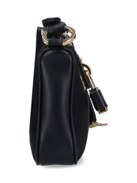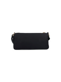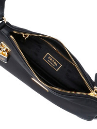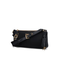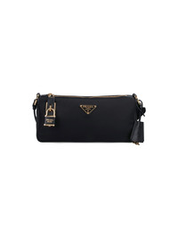 PRADA LOGO SMALL SHOULDER BAG IN BLACK RE-NYLON WITH LEATHER TRIM, ADJUSTABLE SHOULDER STRAP, REMOVABLE KEY CHARM DETAIL, ZIP CLOSURE, REMOVABLE GOLD METAL PADLOCK CHARM DETAIL, ENAMELED METAL TRIANGLE LOGO, INTERIOR ZIP POCKET, MAIN INNER COMPARTMENT. PRODUCT INFO PRODUCT CODE 1BC234 NDO 2C8QF0002 COMPOSITION: 100% POLYAMIDE SIZE AND FIT: H 13 X W 27 X D 4 CM MADE IN: ITALY - STRAP SPAN: 45-55 CM - PRODUCT MADE FROM RECYCLED MATERIALS