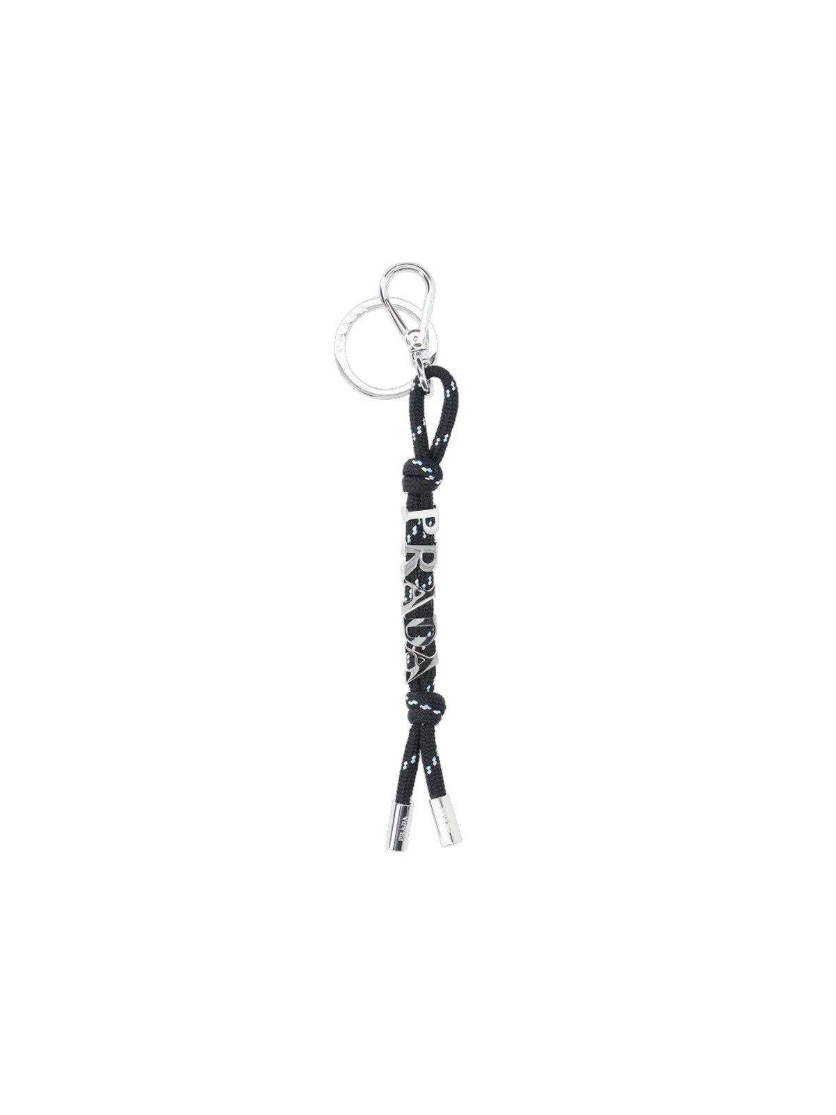 PRADA 'SPEEDROCK' KEYRING IN STEEL AND BLACK RECYCLED FABRIC, SILVER FINISH, KEYCHAIN HOOK, SILVER METAL LETTERING LOGO DETAIL. PRODUCT INFO PRODUCT CODE 2PT014 2HE2F0002 COMPOSITION: 10% STEEL MADE IN: ITALY - TRIMS: 100% METAL - PRODUCT MADE FROM RECYCLED MATERIALS