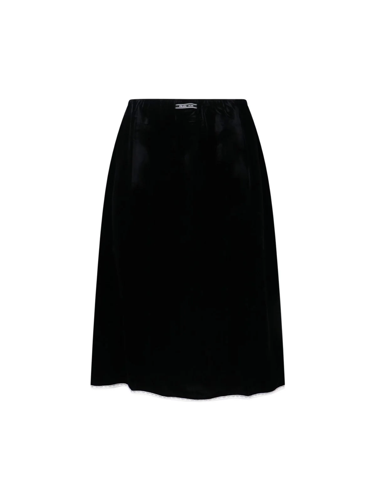 PRADA BLACK VELVET MIDI SKIRT WITH MID WAIST, SIDE BUTTON CLOSURE, BACK LOGO TAG, CONTRAST LACE BAND ON THE HEM. PRODUCT INFO PRODUCT CODE SG6172 OOO 178YF0002 COMPOSITION: 70% VISCOSE, 30% RECYCLED CUPRO SIZE AND FIT: REGULAR FIT MADE IN: ITALY - PRODUCT MADE FROM RECYCLED MATERIALS