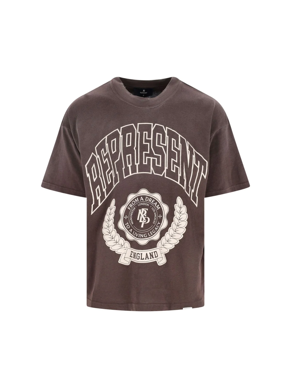 REPRESENT 'LEGACY' BROWN COTTON CREW NECK T-SHIRT WITH SHORT SLEEVES, CONTRAST MAXI PRINT ON THE FRONT, SILVER METAL HARDWARE LOGO DETAIL ON THE FRONT, RIBBED TRIMS, STRAIGHT HEM. PRODUCT INFO PRODUCT CODE MLM10017017 COMPOSITION: 100% COTTON SIZE AND FIT: SOFT FIT MADE IN: PORTUGAL