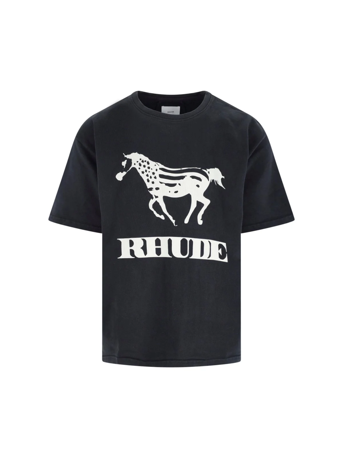 RHUDE 'DINERO' BLACK COTTON CREW NECK T-SHIRT WITH DROPPED SHOULDERS, SHORT SLEEVES, CONTRAST MAXI LOGO PRINT ON THE FRONT, RIBBED TRIMS, STRAIGHT HEM. PRODUCT INFO PRODUCT CODE RHFW25TT010123158 COMPOSITION: 100% COTTON SIZE AND FIT: SOFT FIT MADE IN: UNITED STATES OF AMERICA