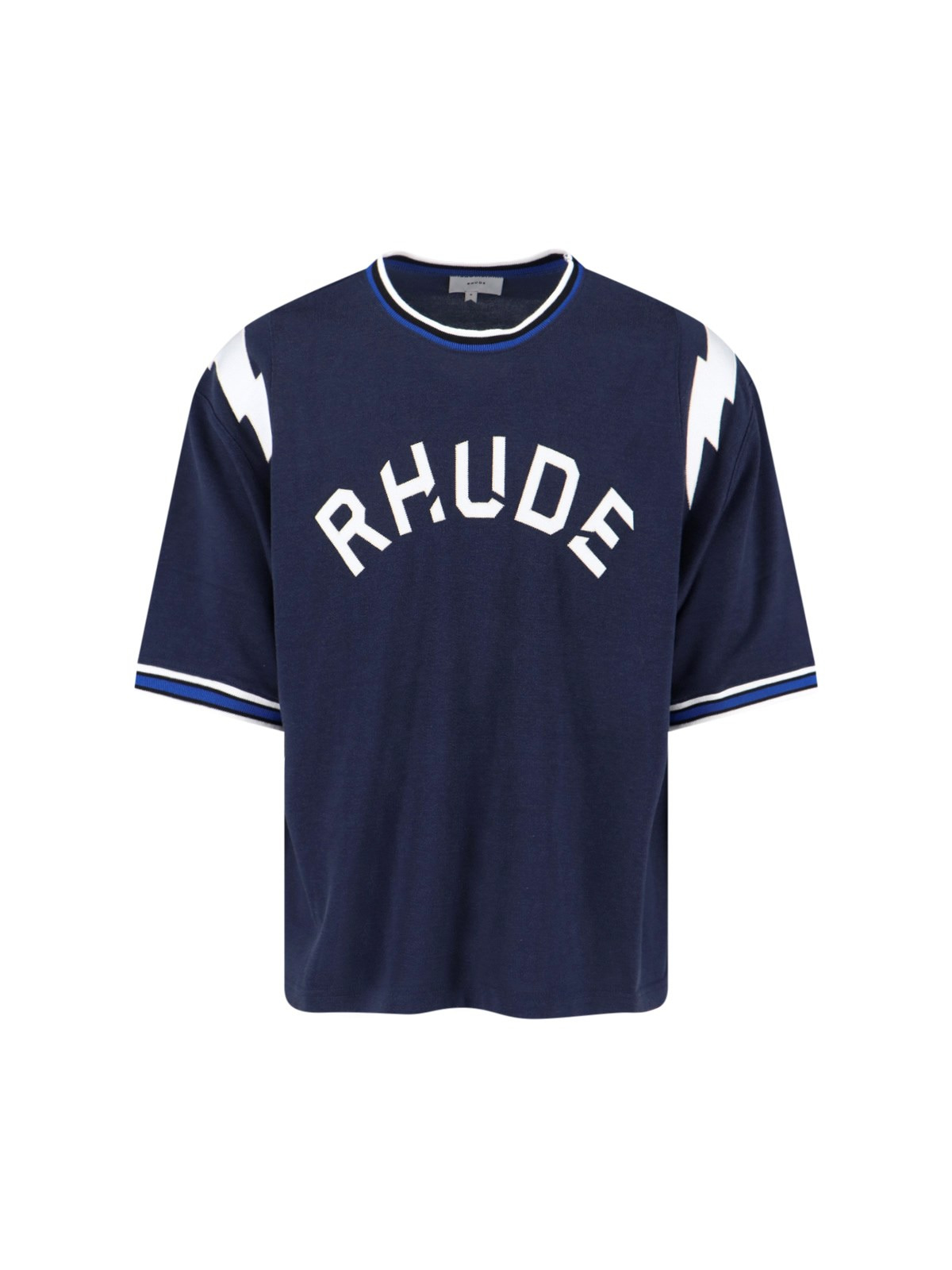 RHUDEM 'RANGER LIGHTNING BOLT' NAVY COTTON BLEND T-SHIRT WITH DROPPED SHOULDERS, MULTICOLOR CREW NECK, CONTRAST CHEST LOGO EMBROIDERY, CONTRAST BOLT DETAIL, STRAIGHT HEM. PRODUCT INFO PRODUCT CODE RHPF25TT017293076 COMPOSITION: 37% RAYON, 63% COTTON SIZE AND FIT: SOFT FIT MADE IN: UNITED STATES OF AMERICA