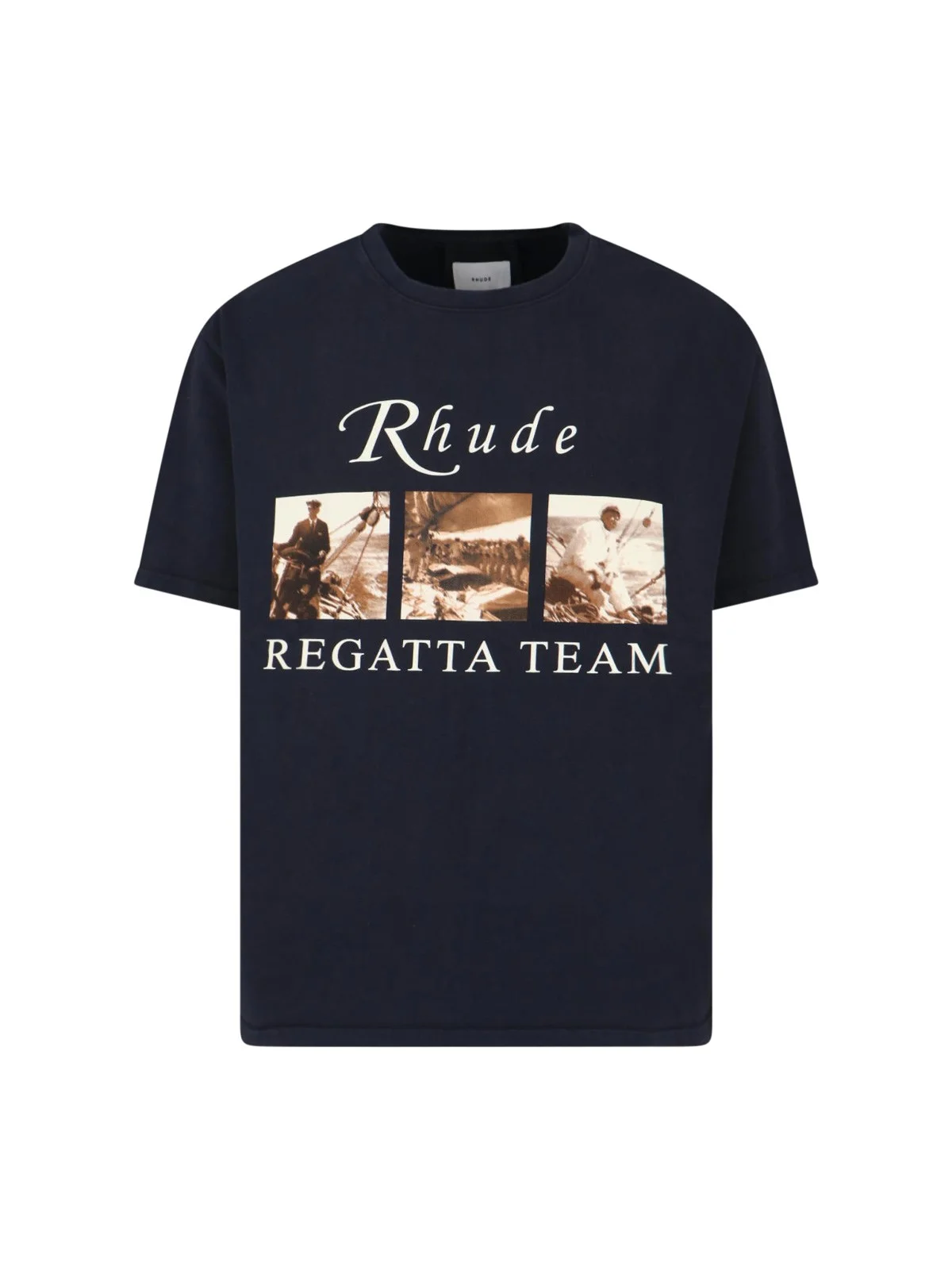 RHUDE 'REGATTA TEAM' BLACK COTTON CREW NECK T-SHIRT WITH SHORT SLEEVES, MAXI MULTICOLOR PRINT ON THE FRONT, MAXI PRINT ON THE BACK, RIBBED TRIMS, STRAIGHT HEM. PRODUCT INFO PRODUCT CODE RHPS26TT130126009 COMPOSITION: 100% COTTON SIZE AND FIT: REGULAR FIT MADE IN: UNITED STATES OF AMERICA