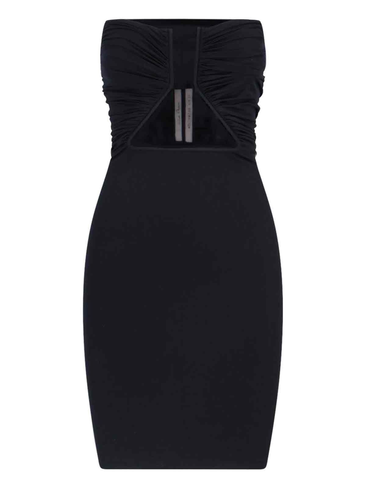 RICK OWENS CUT-OUT MINI DRESS IN BLACK STRETCH NYLON WITH ROUND NECKLINE, SLEEVELESS, CUT-OUT TRIANGLE DETAIL ON THE FRONT, DRAPED DETAILS AT THE WAIST, AND STRAIGHT HEM. PRODUCT INFO PRODUCT CODE RP01E7530 JN09 COMPOSITION: 91% NYLON, 9% ELASTANE SIZE AND FIT: REGULAR FIT MADE IN: ITALY