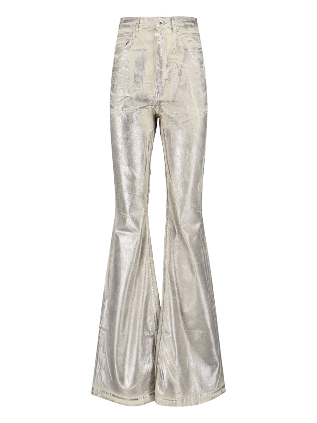 RICK OWENS DRKSHDW BOOTCUT JEANS IN SILVER COTTON BLEND WITH DISTRESSED WASH, HIGH WAIST, BELT LOOPS, BUTTON AND ZIP CLOSURE, FIVE-POCKET DESIGN, STRAIGHT LEG. PRODUCT INFO PRODUCT CODE DS02E7311 SDPF128 COMPOSITION: 90% COTTON, 7% POLYESTER SIZE AND FIT: REGULAR FIT MADE IN: ITALY