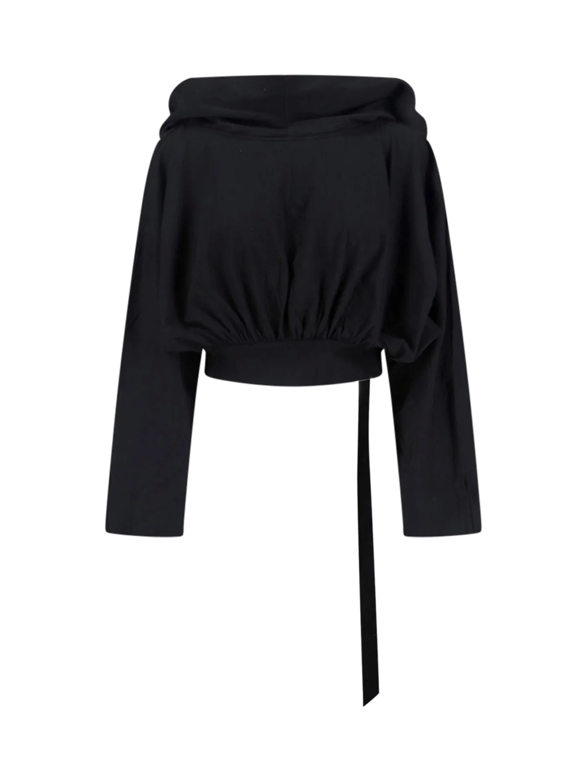 RICK OWENS DRKSHDW COLLEGE GIMP HOODIE IN BLACK COTTON WITH MAXI HOOD AT THE BACK, LONG SLEEVES, CRINKLED DETAILS, RIBBON AT THE BACK, AND STRAIGHT ELASTIC HEM. PRODUCT INFO PRODUCT CODE DS01F4218 RN9 COMPOSITION: 100% COTTON SIZE AND FIT: CROPPED FIT MADE IN: ITALY