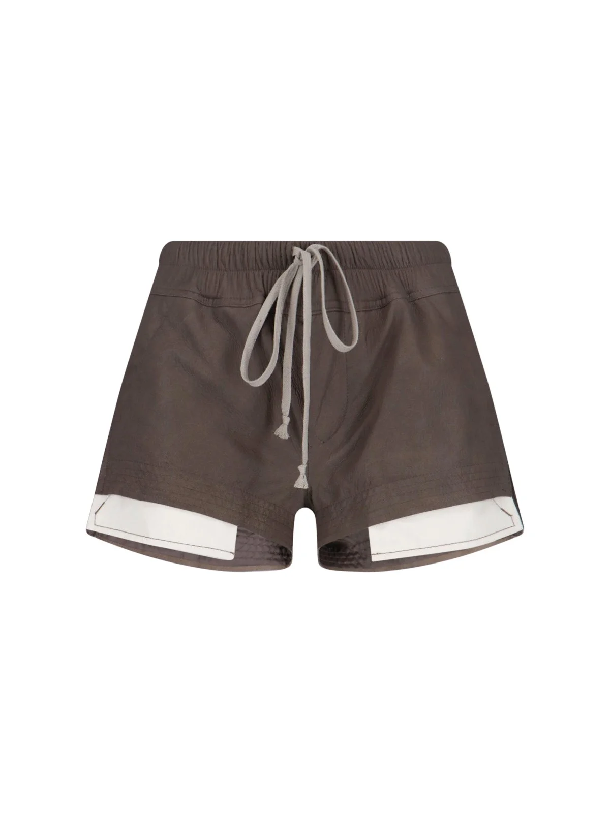 RICK OWENS 'FOG' SHORTS IN BROWN 'MACASSAR WAXY' LAMBSKIN WITH MEDIUM ELASTIC WAISTBAND WITH DRAWSTRING DETAIL, TWO SIDE POCKETS, IRREGULAR HEM. PRODUCT INFO PRODUCT CODE RP01F6316 LBF34 COMPOSITION: 100% LAMBSKIN SIZE AND FIT: REGULAR FIT MADE IN: MOLDOVA