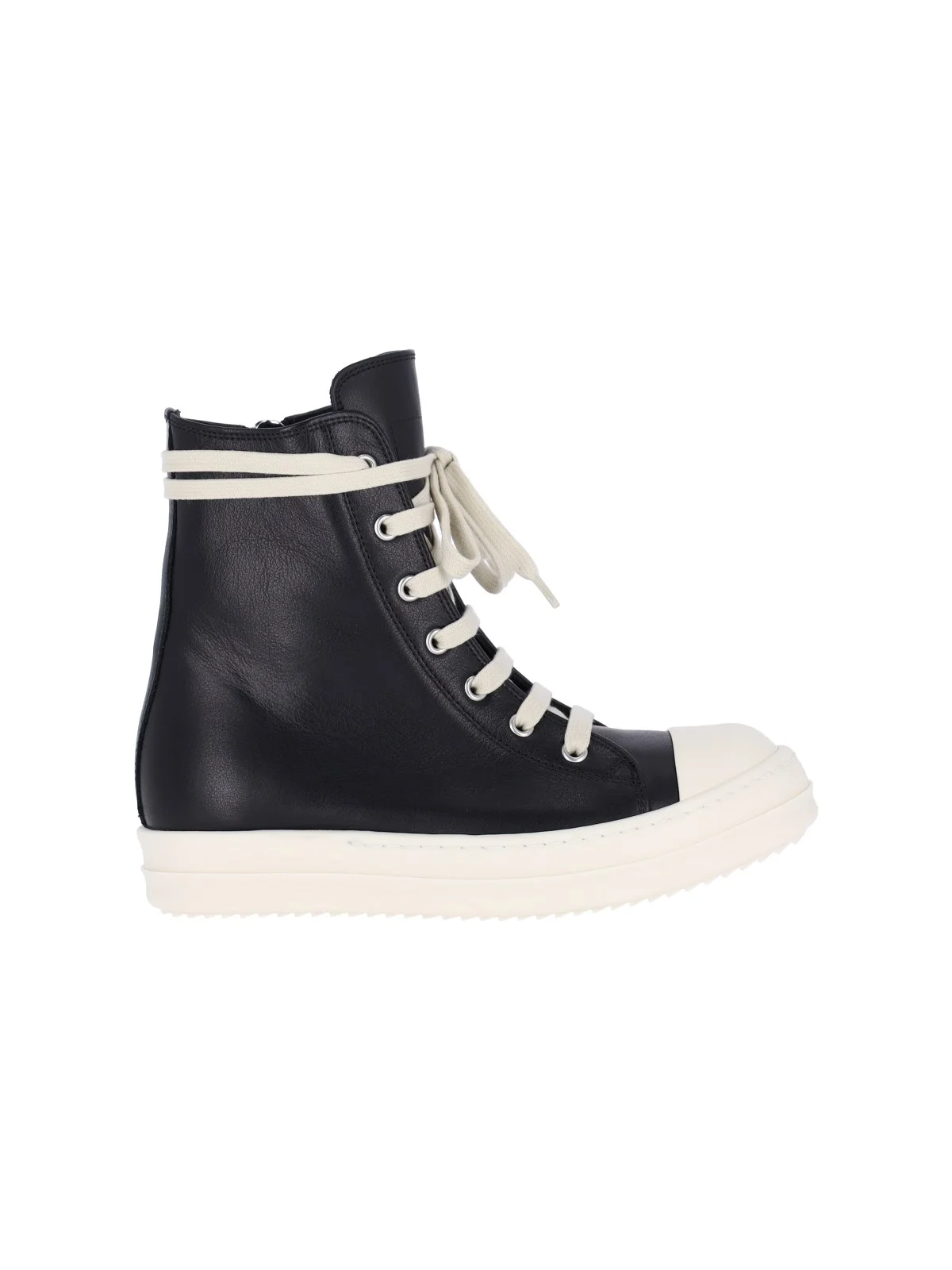 RICK OWENS "HIGH-TOP" SNEAKERS IN BLACK CALF LEATHER WITH ROUND TOE, LACE CLOSURE AND SIDE ZIP, ANKLE LACE DETAIL, RUBBER SOLE. PRODUCT INFO PRODUCT CODE RP01F6890 LCO911 COMPOSITION: 100% CALF LEATHER MADE IN: ITALY - SOLE: 100% RUBBER