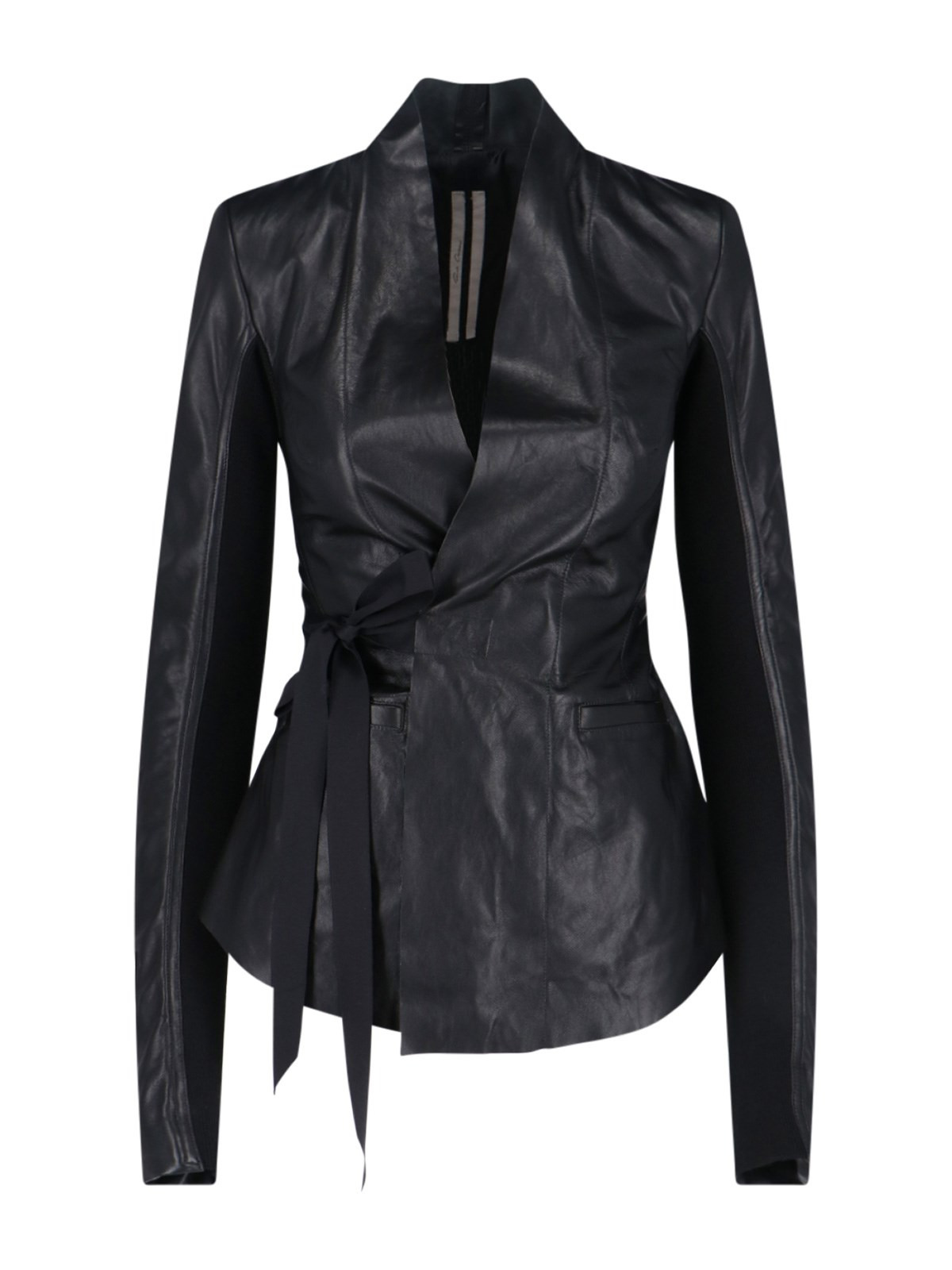 RICK OWENS 'HOLLYWOOD' JACKET IN BLACK LAMBSKIN WITH SHAWL LAPELS, LONG SLEEVES, TIE CLOSURE, TWO SIDE POCKETS, DRAPED BACK DETAIL, CURVED HEM. PRODUCT INFO PRODUCT CODE RP02E4707 LBY09 COMPOSITION: 100% LAMBSKIN SIZE AND FIT: SLIM FIT MADE IN: MOLDOVA