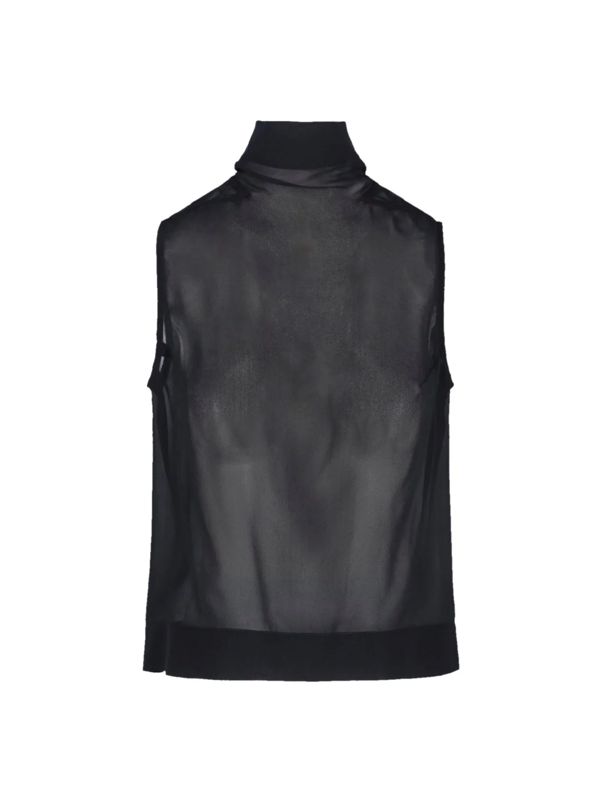RICK OWENS 'JUMBO' SILK TOP IN BLACK WITH HIGH NECK, SLEEVELESS, STRAIGHT HEM. PRODUCT INFO PRODUCT CODE RP01F6116 G09 COMPOSITION: 100% SILK SIZE AND FIT: REGULAR FIT MADE IN: ITALY