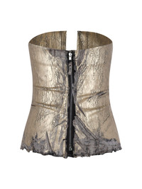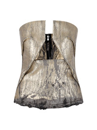RICK OWENS "KUNST" BUSTIER TOP IN GOLD-COATED DENIM WITH WORN DETAILS, ROUND NECKLINE, TRIANGLE CUT-OUT ON THE FRONT, BACK ZIP CLOSURE, RAW CUT HEM. PRODUCT INFO PRODUCT CODE RP01E7130 SGMC02 COMPOSITION: 91% COTTON, 6% ELASTOMULTIESTER, 3% RUBBER SIZE AND FIT: REGULAR FIT MADE IN: ITALY