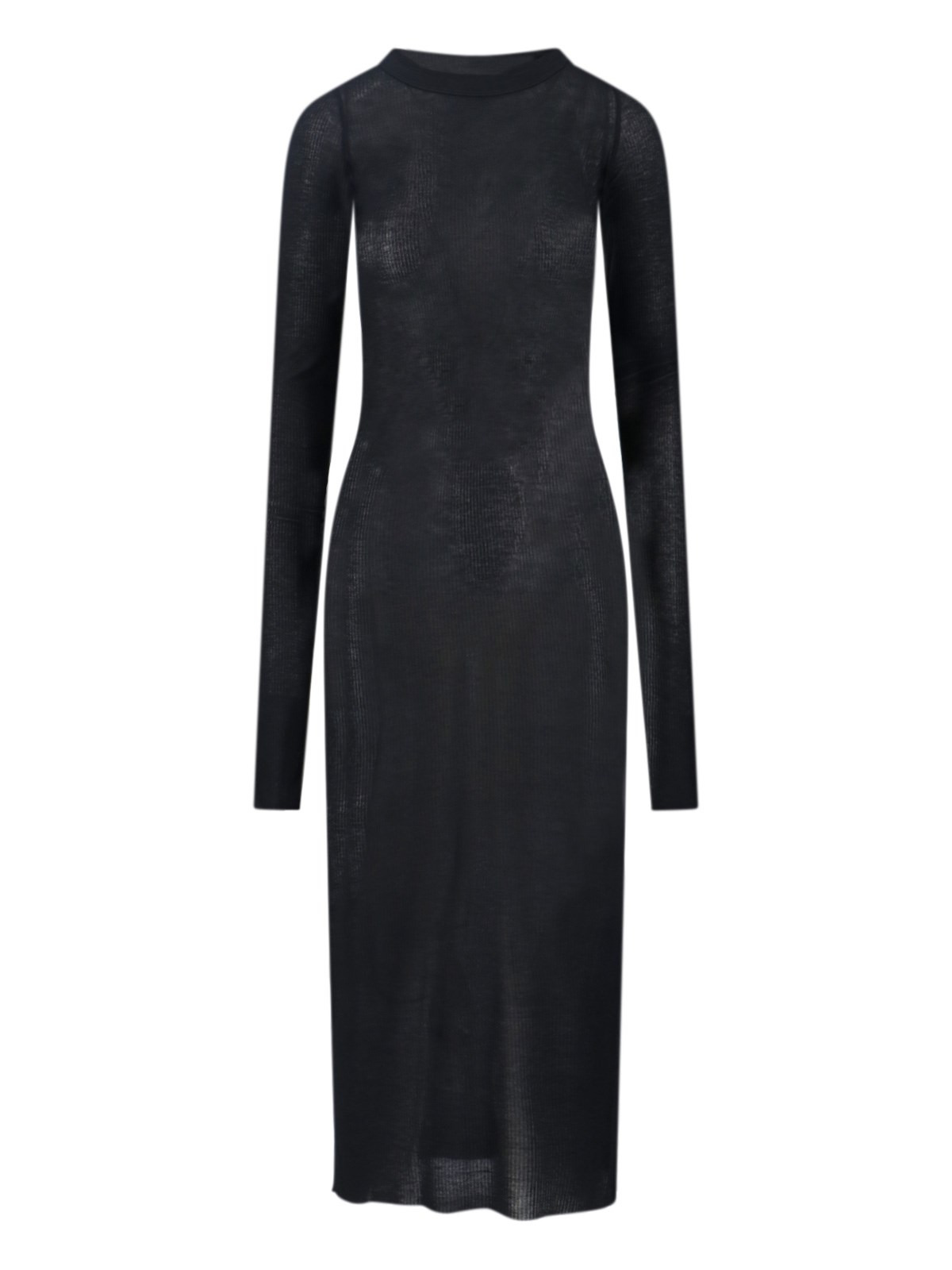 RICK OWENS MIDI DRESS IN VISCOSE AND BLACK SILK, CREW NECK, RIBBED KNIT, STRAIGHT HEM. PRODUCT INFO PRODUCT CODE RP02E4546 RC09 COMPOSITION: 88% VISCOSE, 12% SILK SIZE AND FIT: REGULAR FIT MADE IN: ITALY