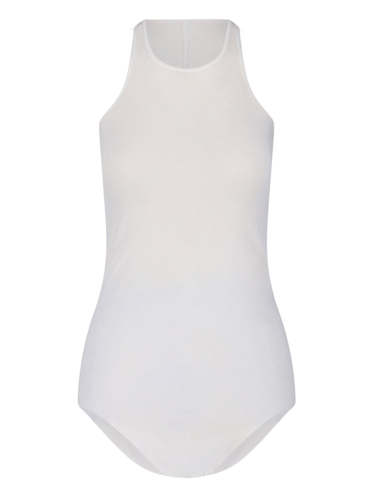 RICK OWENS SEMI-TRANSPARENT BODYSUIT IN WHITE COTTON WITH ROUND NECKLINE, SLEEVELESS, HIGH-CUT DESIGN PRODUCT INFO PRODUCT CODE RP02E4101 MR11 COMPOSITION: 100% COTTON SIZE AND FIT: REGULAR FIT MADE IN: ITALY