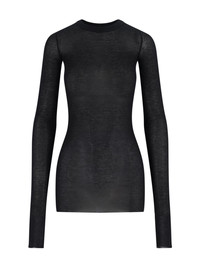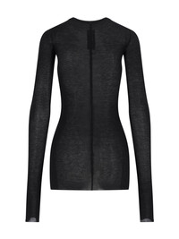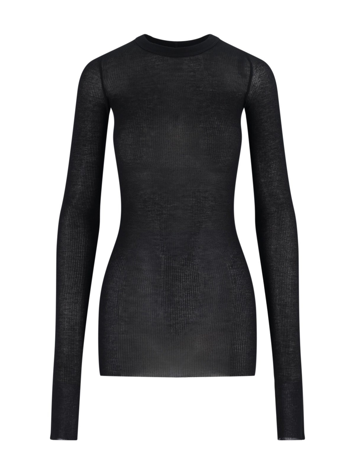 RICK OWENS BLACK VISCOSE AND SILK T-SHIRT WITH RIBBED PATTERN, CREW NECK, LONG SLEEVES, STRAIGHT HEM. PRODUCT INFO PRODUCT CODE RP02E4202 RC09 COMPOSITION: 88% VISCOSE, 12% SILK SIZE AND FIT: REGULAR FIT MADE IN: ITALY