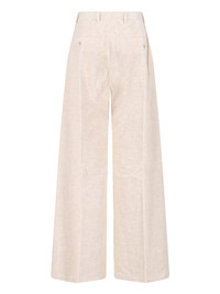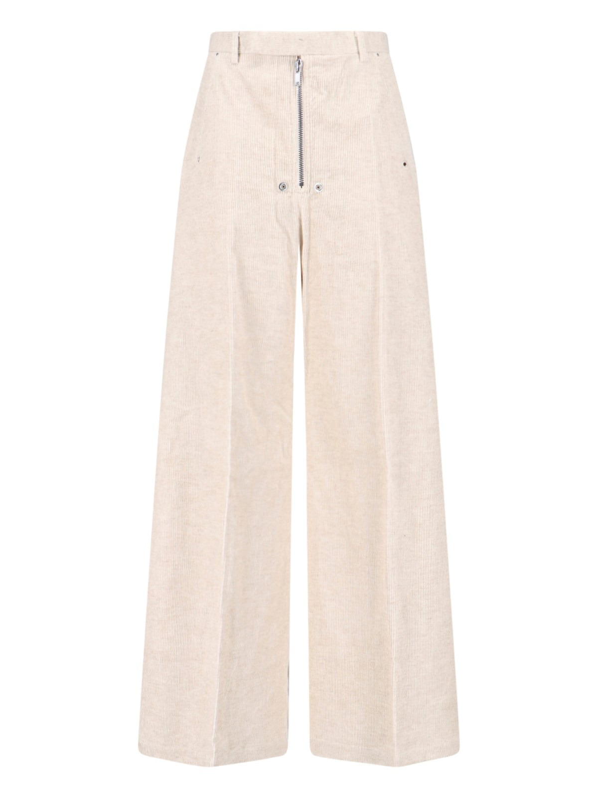 RICK OWENS WIDE PANTS IN CREAM COTTON BLEND WITH CORDUROY KNIT, MID WAIST, BELT LOOPS, HOOK AND ZIP CLOSURE, FRONT BUTTON DETAILS, TWO FRONT PLEATS, TWO SIDE POCKETS, TWO BACK WELT POCKETS, TWO BACK PLEATS, WIDE LEG. PRODUCT INFO PRODUCT CODE RP02E4355 MLC21 COMPOSITION: 74% COTTON, 26% LINEN, BUTTONS: 100% BUFFALO HORN SIZE AND FIT: SOFT FIT MADE IN: ITALY