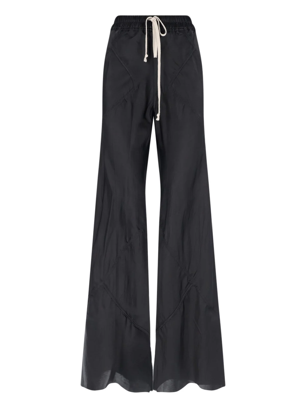 RICK OWENS WIDE BLACK CUPRO PANTS WITH HIGH WAIST, ADJUSTABLE DRAWSTRING AT THE WAIST, TWO BUTTON BACK FLAP POCKETS, WIDE LEG. PRODUCT INFO PRODUCT CODE RP01F6304 N09 COMPOSITION: 100% CUPRO SIZE AND FIT: REGULAR FIT MADE IN: ITALY