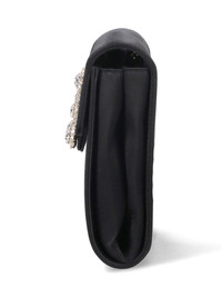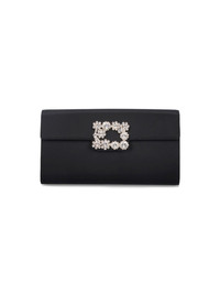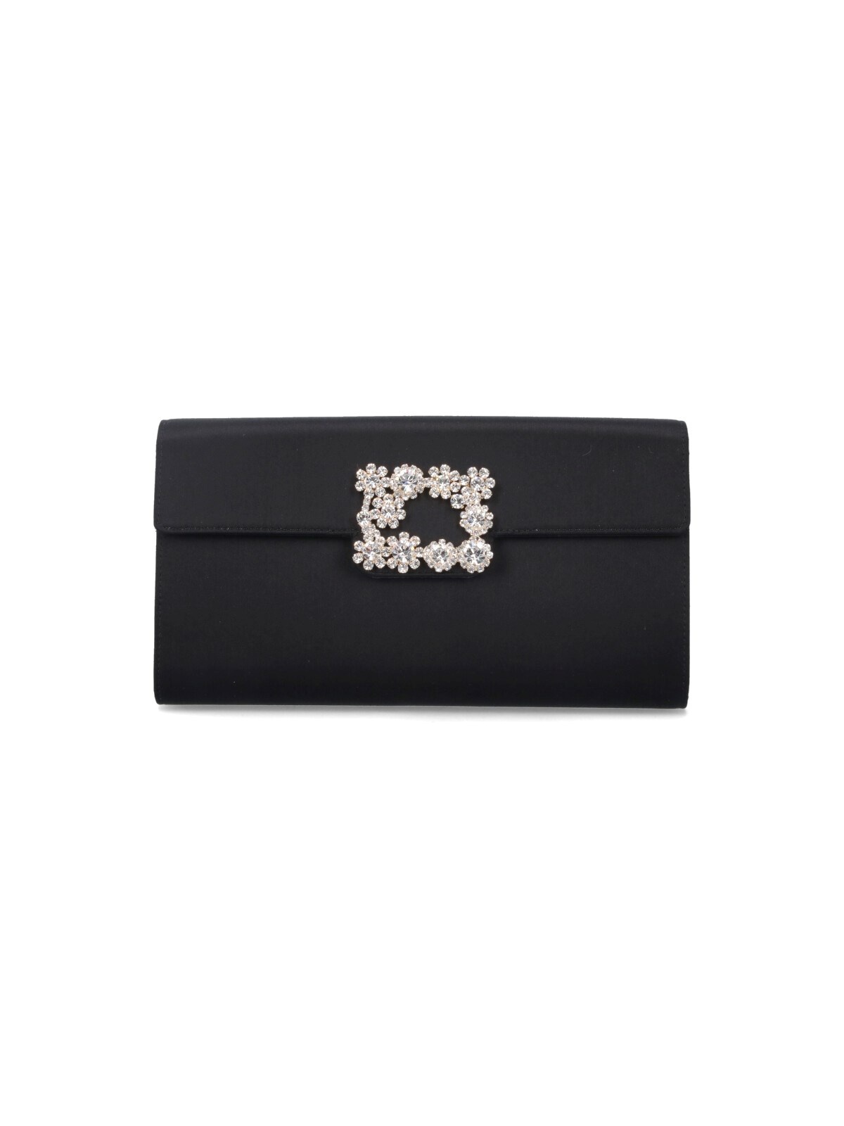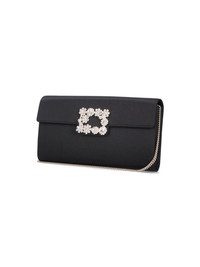 ROGER VIVIER BLACK 'EFFLORESCENCE' SATIN CLUTCH BAG WITH GOLD METAL SLIDING CHAIN SHOULDER STRAP, SNAP BUTTON FLAP CLOSURE, GOLD METAL FLORAL BUCKLE ON THE FRONT, CRYSTAL RHINESTONE DETAIL, TWO SEPARATE INNER COMPARTMENTS. PRODUCT INFO PRODUCT CODE RBWAMFD0200RS0B999 COMPOSITION: 100% TEXTILE SIZE AND FIT: H 13 X W 24 X D 3.5 CM MADE IN: ITALY - DETAILS: 100% CRYSTAL
