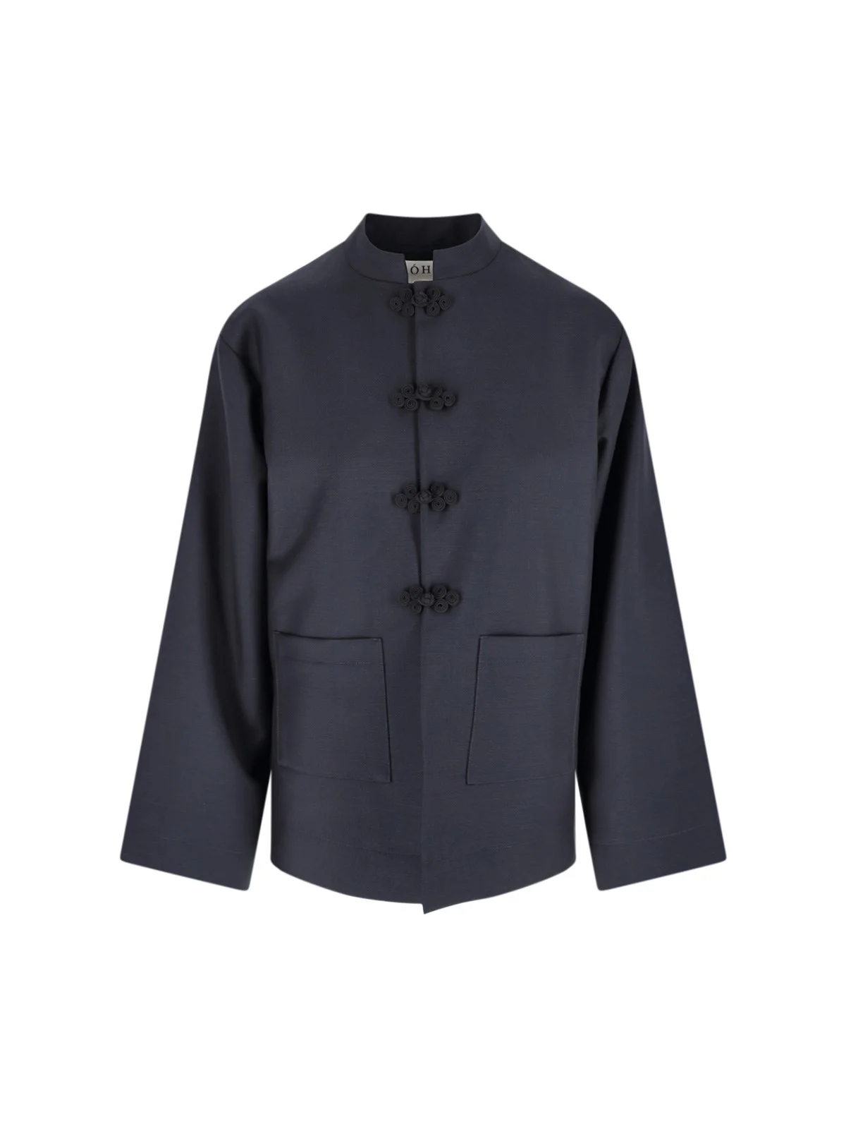 ROHE 'MANDARIN' JACKET IN NAVY VIRGIN WOOL AND MOHAIR BLEND WITH MANDARIN COLLAR, FRONT TOGGLE CLOSURE, LONG SLEEVES, TWO FRONT POCKETS, AND CUVO HEM. PRODUCT INFO PRODUCT CODE 418 11 223410 322 COMPOSITION: 73% VIRGIN WOOL, 27% MOHAIR SIZE AND FIT: REGULAR FIT MADE IN: CHINA