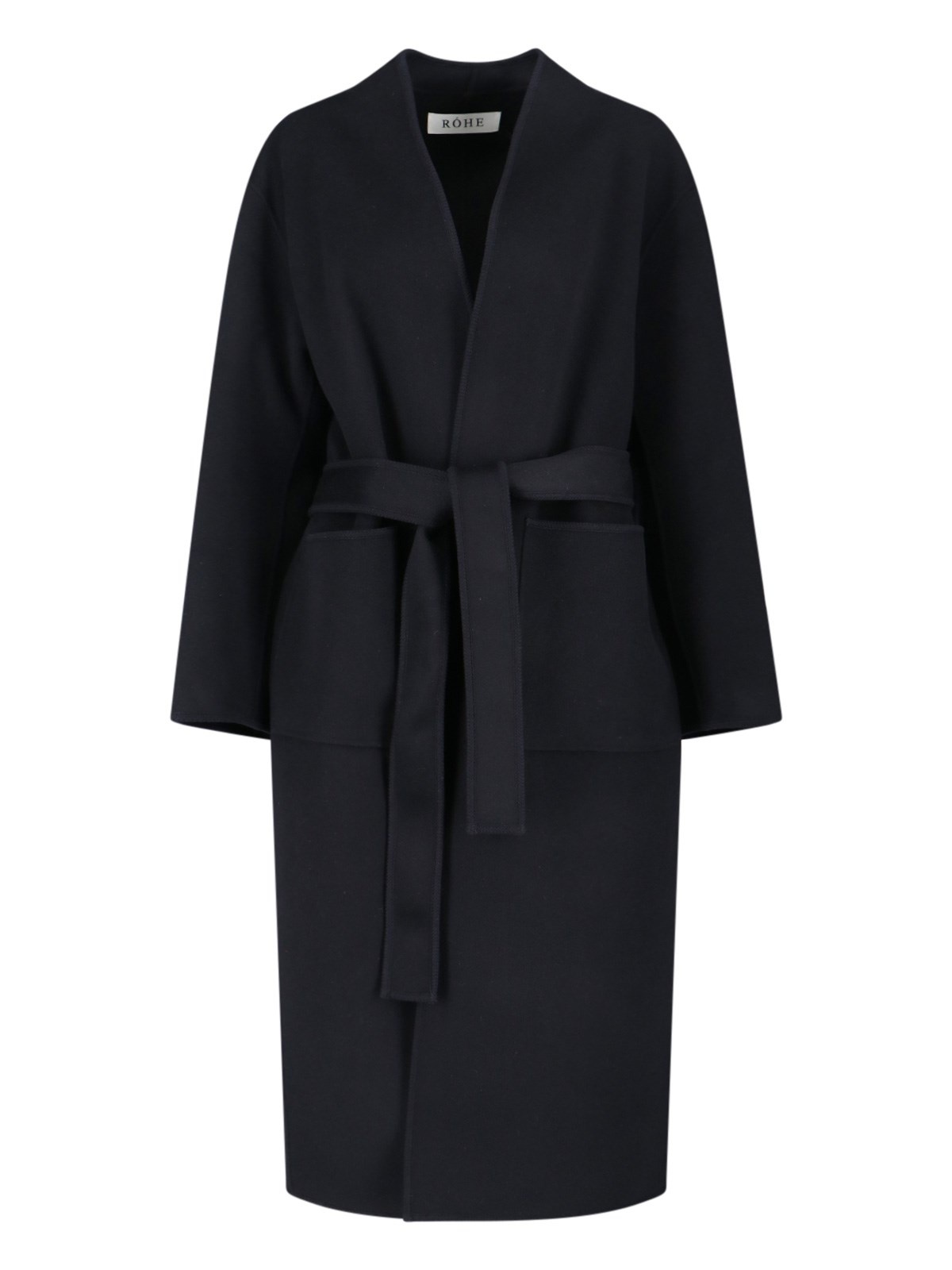 ROHE BLACK WOOL COAT WITH SHAWL COLLAR, ADJUSTABLE BELT AT THE WAIST, TWO SIDE FLAT POCKETS, CENTRAL BACK VENT, STRAIGHT HEM. PRODUCT INFO PRODUCT CODE 416 10 005001 308 COMPOSITION: 100% WOOL SIZE AND FIT: REGULAR FIT MADE IN: CHINA