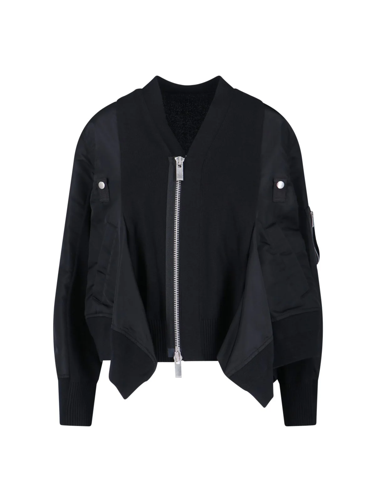 SACAI ZIP BOMBER JACKET IN BLACK COTTON BLEND WITH V-NECK, DOUBLE ZIP CLOSURE, TWO SIDE POCKETS, FABRIC INSERTS ON THE FRONT, SILVER STUDS DETAIL, A ZIP POCKET ON THE SLEEVE, RIBBED CUFFS, ASYMMETRICAL HEM. PRODUCT INFO PRODUCT CODE 25 07996001 COMPOSITION: 57% COTTON, 43% POLYESTER SIZE AND FIT: REGULAR FIT MADE IN: CHINA - TRIMS: 100% METAL
