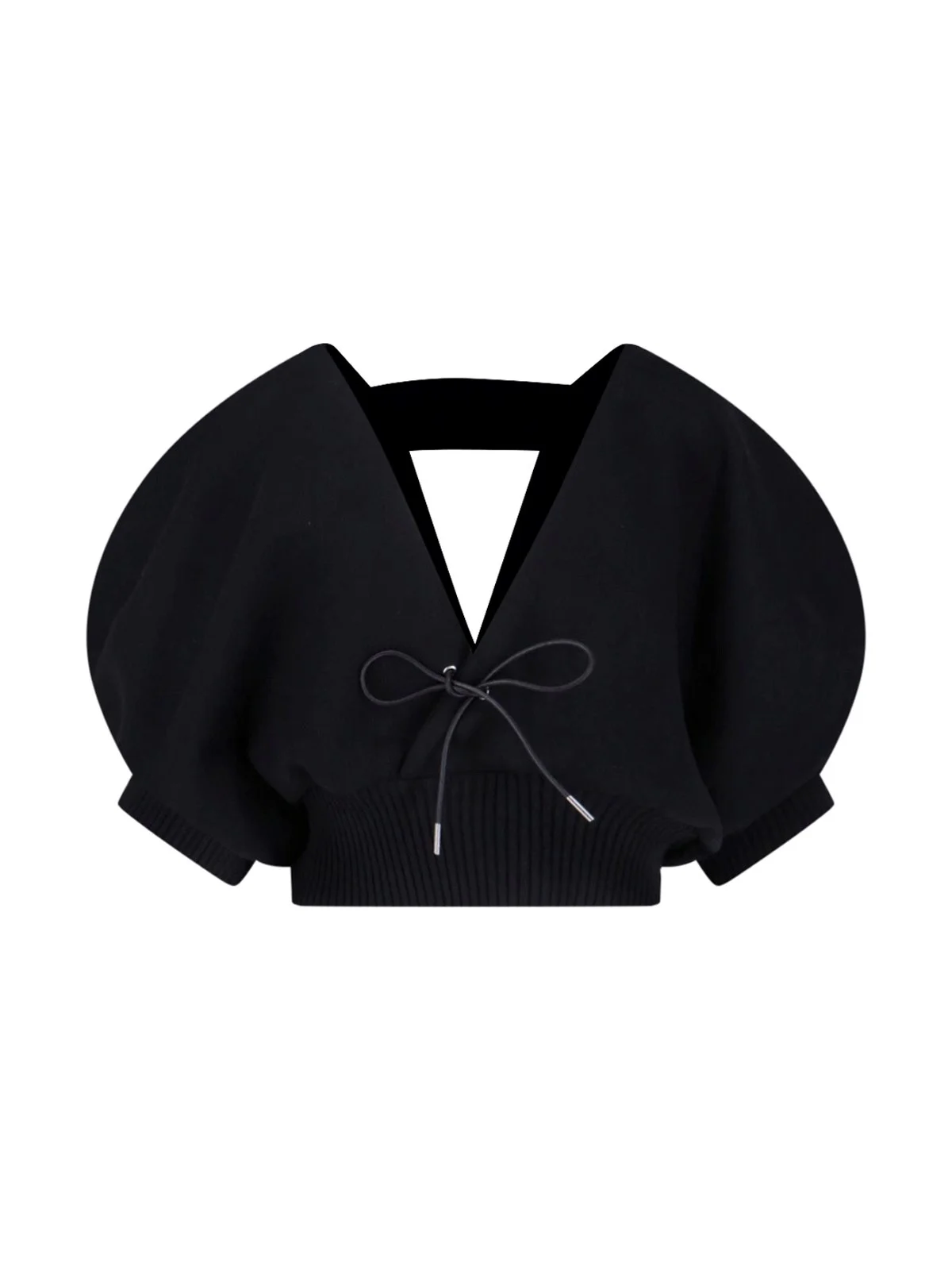 SACAI BOW CARDIGAN IN BLACK COTTON BLEND WITH V-NECK, SHORT SLEEVES, FRONT BAND DETAIL, RIBBED TRIM. PRODUCT INFO PRODUCT CODE 26 08487001 COMPOSITION: 64% COTTON, 22% POLYESTER, 11% CASHMERE, 2% NYLON, 1% POLYURETHANE SIZE AND FIT: CROPPED FIT MADE IN: JAPAN