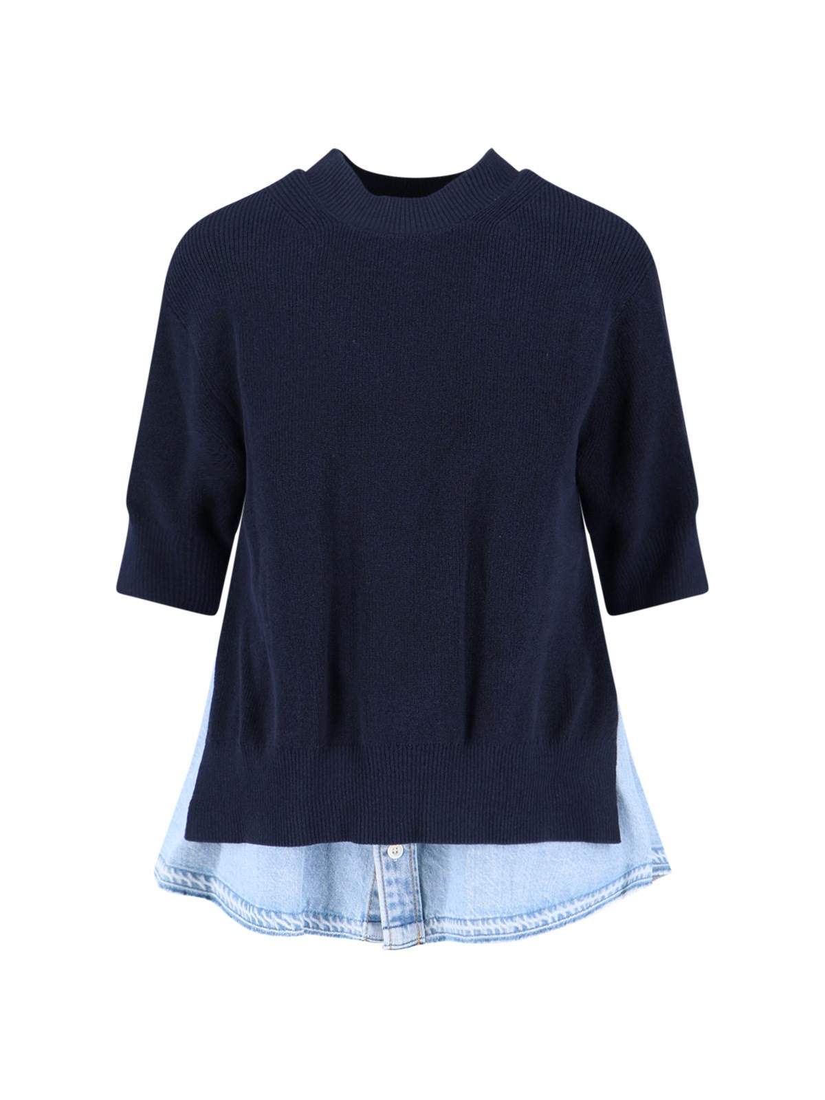 SACAI LAYERED SWEATER IN NAVY BLEND WITH RIBBED KNIT, CREWNECK, THREE-QUARTER SLEEVES, LIGHT BLUE DENIM SHIRT DETAIL, SIDE SLITS, CURVED HEM. PRODUCT INFO PRODUCT CODE 25 07969211 COMPOSITION: 57% COTTON, 43% POLYESTER SIZE AND FIT: REGULAR FIT MADE IN: JAPAN