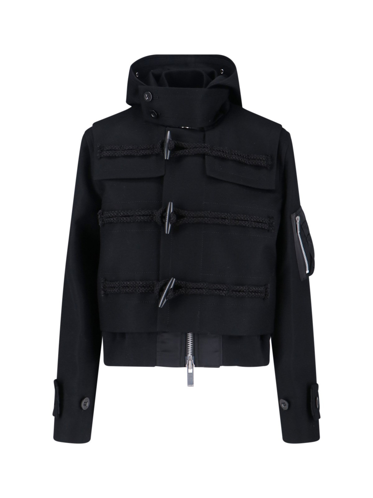 SACAI 'MELTON' WOOL JACKET IN NAVY SHADES, LAYERED DESIGN, HOOD, STUDS DETAIL, MONTGOMERY AND ZIP CLOSURE, ZIP POCKET ON THE SLEEVE, CONTRAST, BUTTON CUFFS, STRAIGHT HEM. PRODUCT INFO PRODUCT CODE 25 08069001 COMPOSITION: 100% WOOL, PART 1: 100% NYLON, PART 2: 55% POLYESTER, 44% COTTON, 1% POLYURETHANE SIZE AND FIT: REGULAR FIT MADE IN: JAPAN