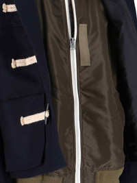 SACAI WOOL JACKET IN NAVY SHADES, GREEN DETAILS, HIGH NECK, HOOD, BUTTON DETAIL, INTERLOCKING AND ZIP CLOSURE WITH BUTTONS ON CUFFS, STRAIGHT HEM. PRODUCT INFO PRODUCT CODE 25 03846M233 COMPOSITION: 100% WOOL SIZE AND FIT: REGULAR FIT MADE IN: JAPAN - TRIMS: 100% METAL