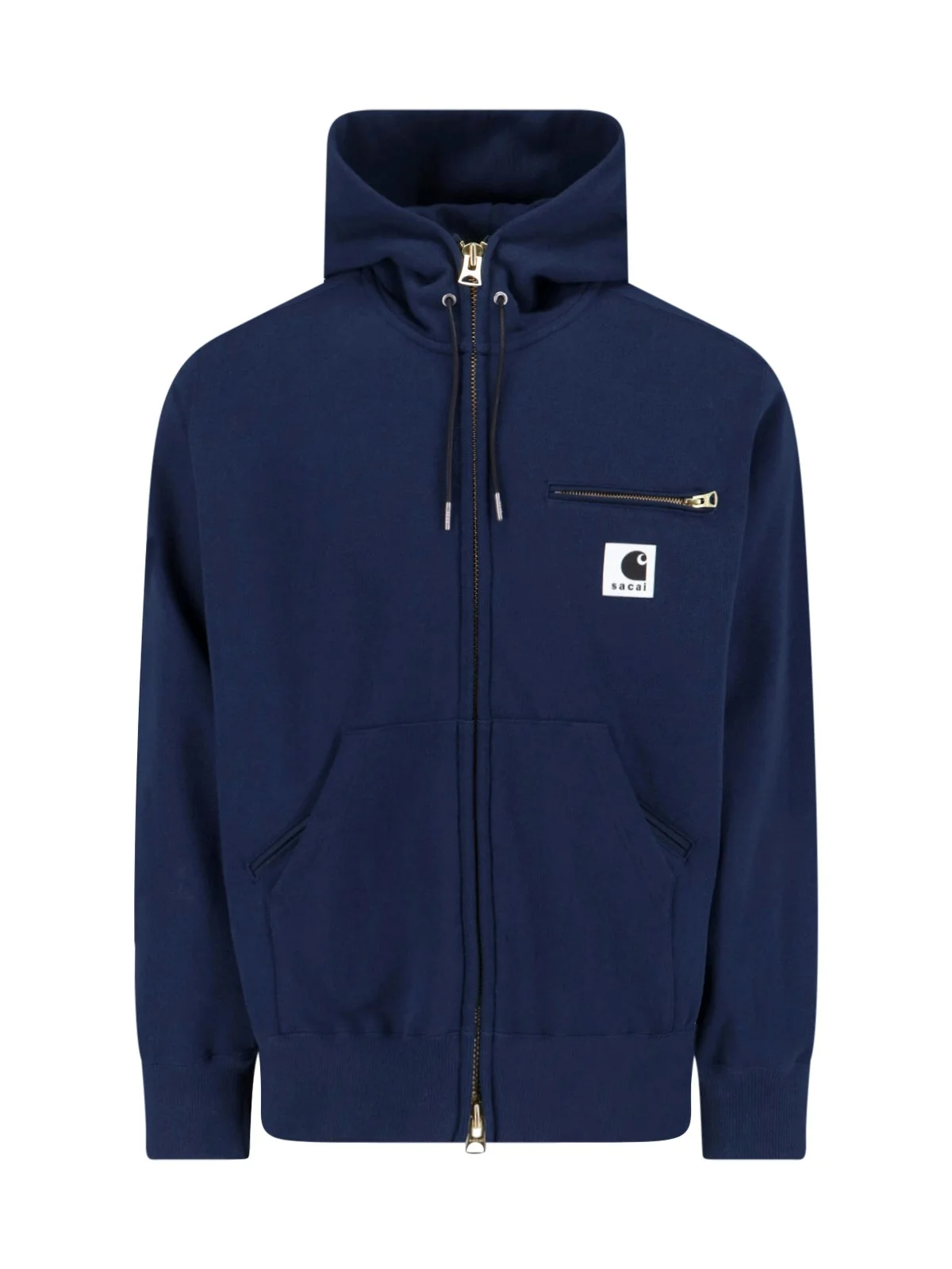SACAI X CARHARTT WIP BLUE COTTON ZIP JACKET WITH HOOD, ZIP CLOSURE, LONG SLEEVES, TWO FRONT POCKETS, ONE CHEST ZIP POCKET, CONTRASTING LOGO PATCH AT THE FRONT, STRAIGHT HEM. PRODUCT INFO PRODUCT CODE 26 01091S401 COMPOSITION: 100% COTTON SIZE AND FIT: SOFT FIT MADE IN: JAPAN