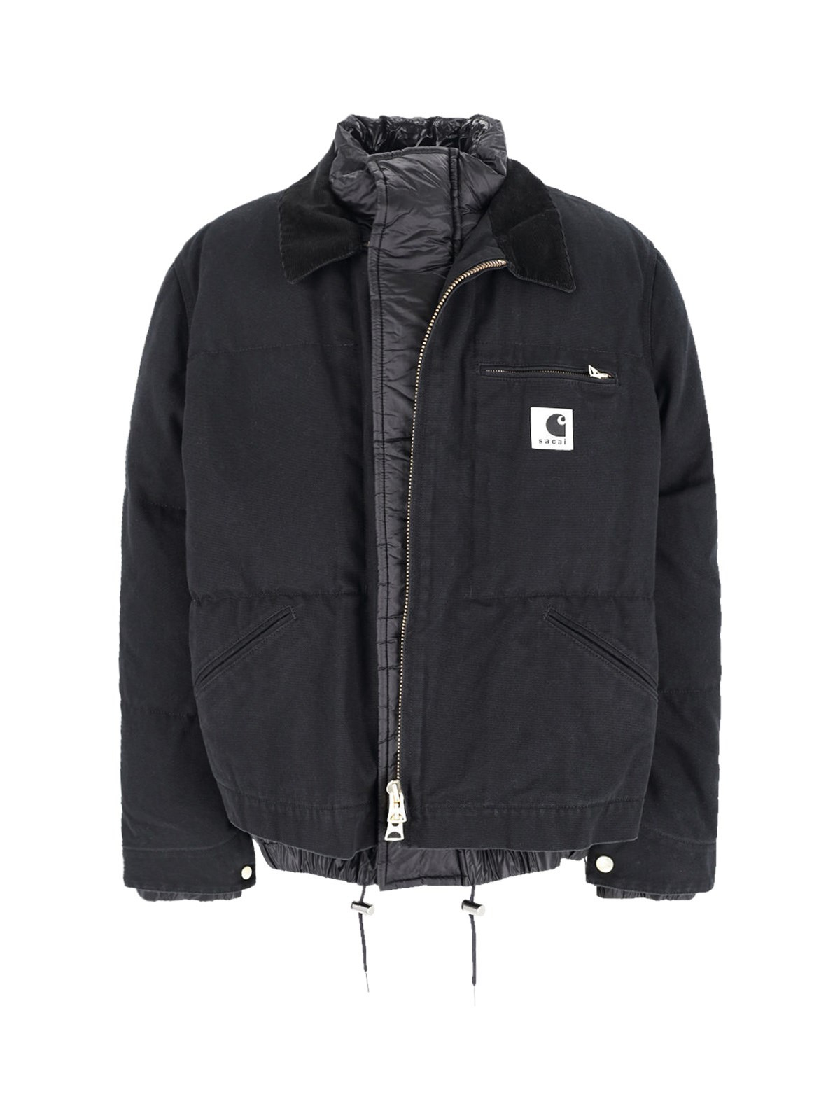 SACAI X CARHARTT WIP 'DETROIT JACKET' JACKET IN BLACK COTTON DENIM WITH LAYERED DESIGN, PADDED AND QUILTED DOWN DETAIL, SNAP BUTTON FLAP AND ZIP CLOSURE, CLASSIC VELVET COLLAR, CHEST ZIP POCKET, CONTRASTING LOGO PATCH ON THE FRONT, TWO SIDE POCKETS, INNER FLAT POCKET, DRAWSTRING AT THE HEM, BUTTON CUFFS, ADJUSTABLE BUTTONS AT THE BACK, STRAIGHT HEM. PRODUCT INFO PRODUCT CODE 25 03858M001 COMPOSITION: 100% COTTON SIZE AND FIT: REGULAR FIT MADE IN: JAPAN