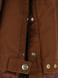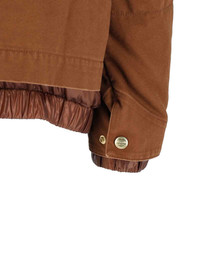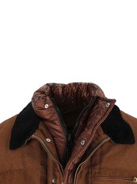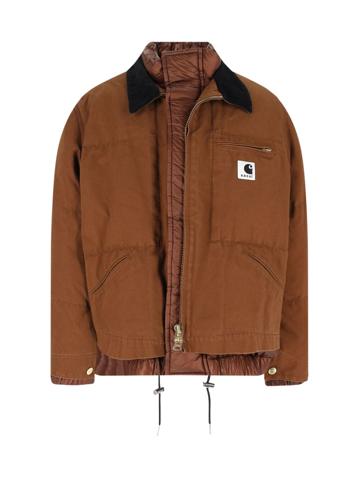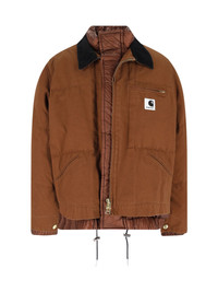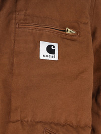 SACAI X CARHARTT WIP 'DETROIT JACKET' JACKET IN BROWN COTTON DENIM WITH LAYERED DESIGN, PADDED AND QUILTED DOWN DETAIL, SNAP BUTTON FLAP AND ZIP CLOSURE, CLASSIC VELVET COLLAR, CHEST ZIP POCKET, CONTRASTING LOGO PATCH ON THE FRONT, TWO SIDE POCKETS, INNER FLAT POCKET, DRAWSTRING AT THE HEM, BUTTON CUFFS, ADJUSTABLE BUTTONS AT THE BACK, STRAIGHT HEM. PRODUCT INFO PRODUCT CODE 25 03858M642 COMPOSITION: 100% COTTON SIZE AND FIT: REGULAR FIT MADE IN: JAPAN