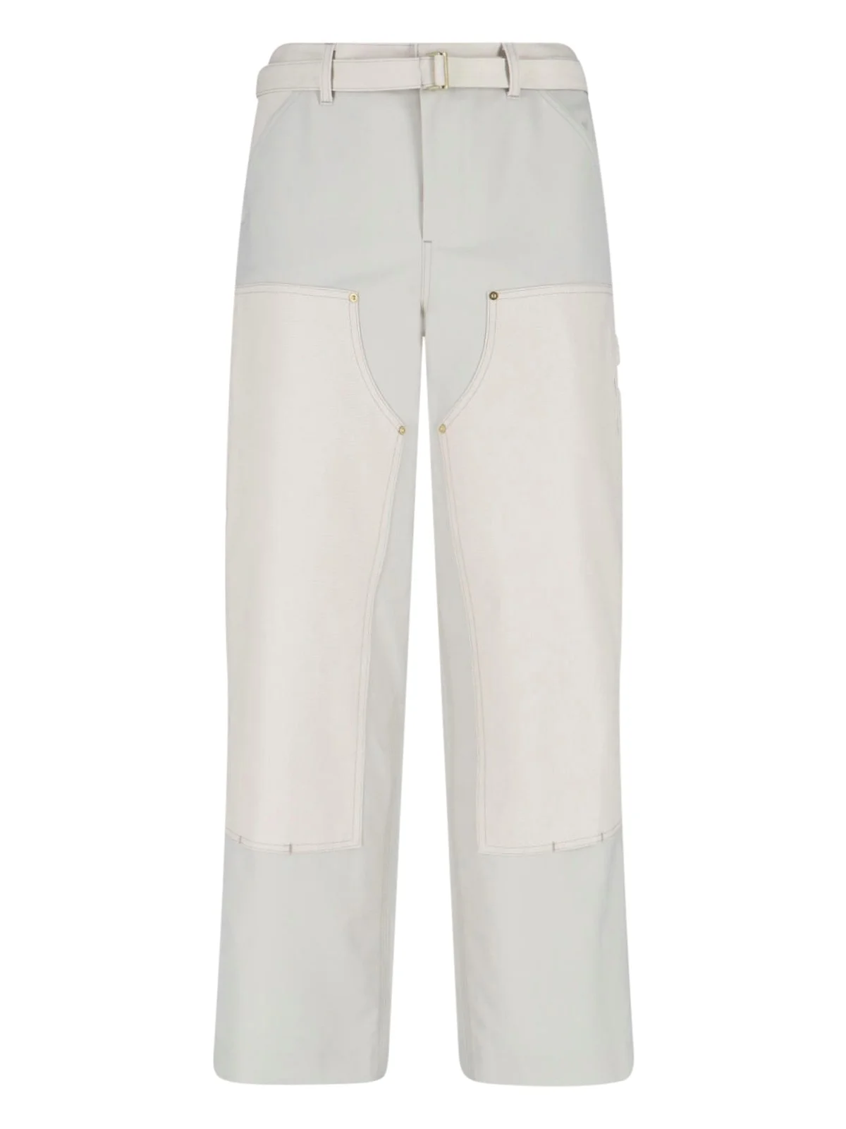 SACAI X CARHARTT WIP DOUBLE KNEE PANTS IN WHITE FABRIC AND WOOL, MID WAIST, BUTTON AND ZIP CLOSURE, BUCKLE BELT, TWO SLANTED SIDE POCKETS, TWO BACK POCKETS, BACK LOGO PATCH, STRAIGHT LEG. PRODUCT INFO PRODUCT CODE 26 03993M199 COMPOSITION: 70% POLYESTER, 30% WOOL SIZE AND FIT: REGULAR FIT MADE IN: JAPAN