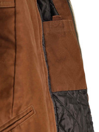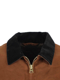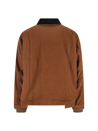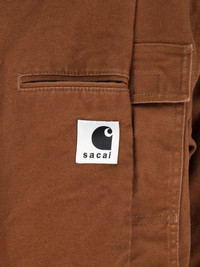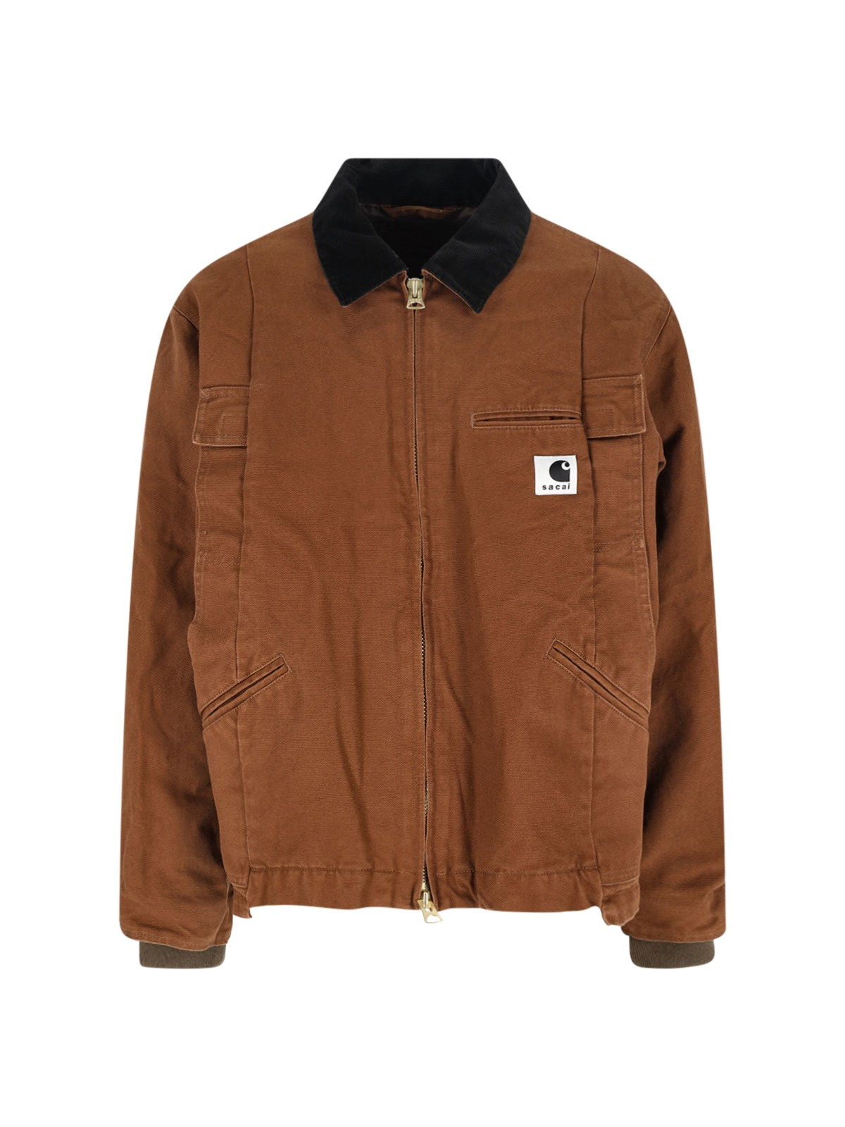 SACAI X CARHARTT WIP 'DUCK JACKET' JACKET IN BROWN COTTON DENIM WITH CLASSIC CORDUROY COLLAR, DOUBLE ZIP CLOSURE, THREE UPPER CHEST POCKETS, CONTRASTING LOGO PATCH AT THE FRONT, TWO SIDE POCKETS, ONE INNER POCKET, ELASTICATED CUFFS, STRAIGHT HEM. PRODUCT INFO PRODUCT CODE 25 00990S642 COMPOSITION: 100% COTTON SIZE AND FIT: SOFT FIT MADE IN: JAPAN