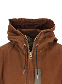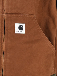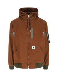 SACAI X CARHARTT WIP 'OG ACTIVE' BROWN COTTON JACKET WITH DRAWSTRING HOOD, DOUBLE ZIP CLOSURE, TWO SIDE POCKETS, CONTRAST LOGO PATCH AT THE FRONT, METAL STUDS DETAIL AT THE FRONT, ZIP POCKET ON THE SLEEVE, CONTRAST RIBBED TRIM, STRAIGHT HEM. PRODUCT INFO PRODUCT CODE 25 03859M642 COMPOSITION: 100% COTTON SIZE AND FIT: REGULAR FIT MADE IN: JAPAN