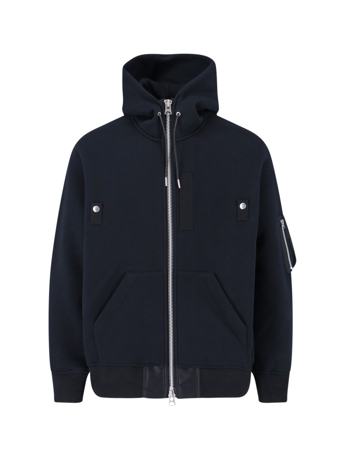 SACAI ZIP SWEATSHIRT IN BLACK COTTON BLEND WITH DRAWSTRING HOOD, ZIP CLOSURE, FRONT SILVER BUTTON DETAILS, ONE ZIP POCKET ON THE SLEEVE, TWO SIDE POCKETS, CUFFS AND ELASTIC HEM. PRODUCT INFO PRODUCT CODE 25 03788M001 COMPOSITION: 62% COTTON, 38% POLYESTER, PARTS1: 100% NYLON, PARTS2: 55% POLYESTER, 44% COTTON, 1% POLYURETHANE SIZE AND FIT: REGULAR FIT MADE IN: JAPAN