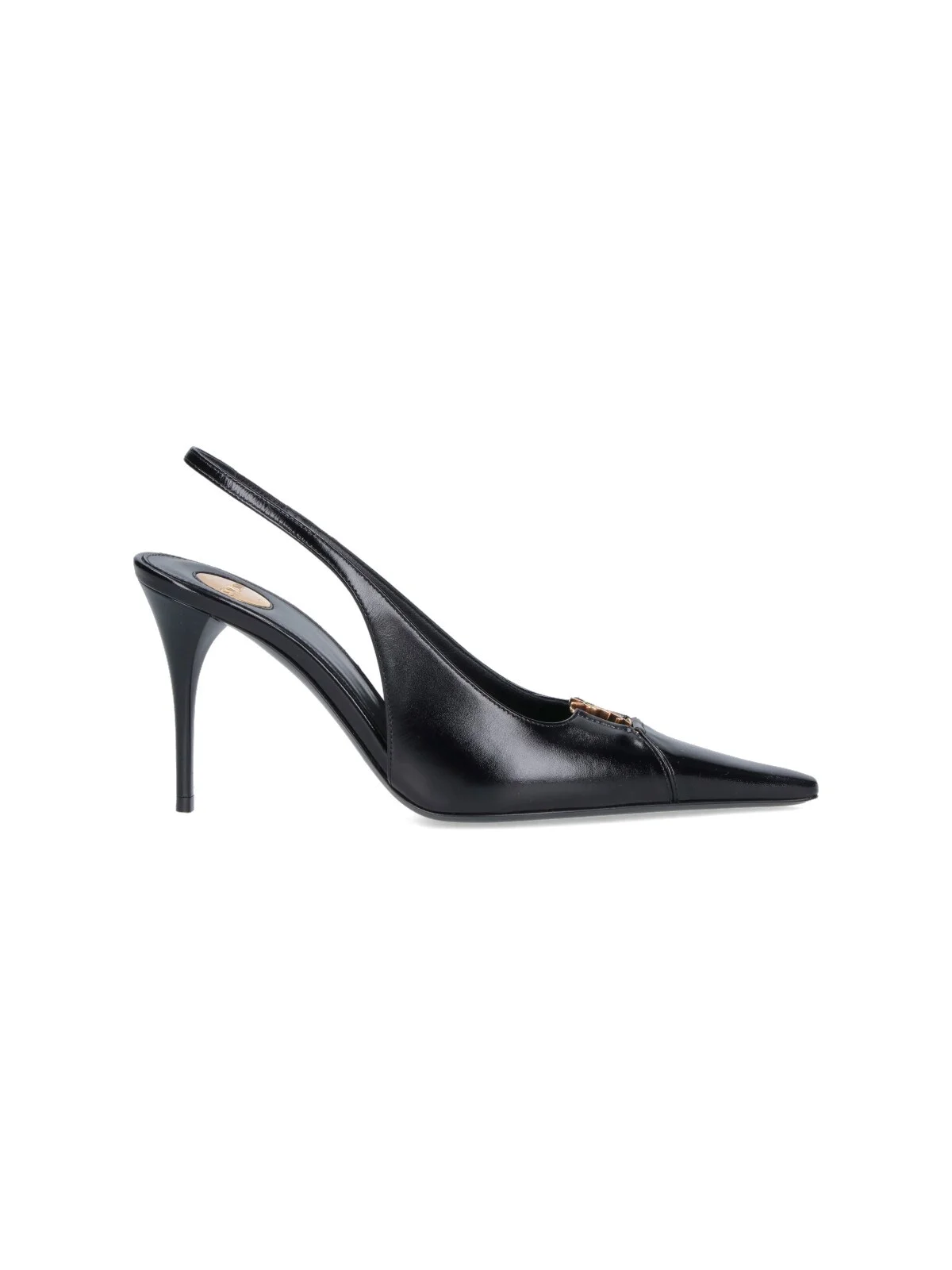 SAINT LAURENT "BABYLONE" SLINGBACK PUMPS IN BLACK LEATHER WITH SQUARE TOE, GOLD METAL LOGO ON THE TOP, SLIP-ON FIT, STILETTO HEEL, LEATHER SOLE. PRODUCT INFO PRODUCT CODE 806685 AAESX1000 COMPOSITION: 100% CALF LEATHER MADE IN: ITALY - SOLE: 100% LEATHER