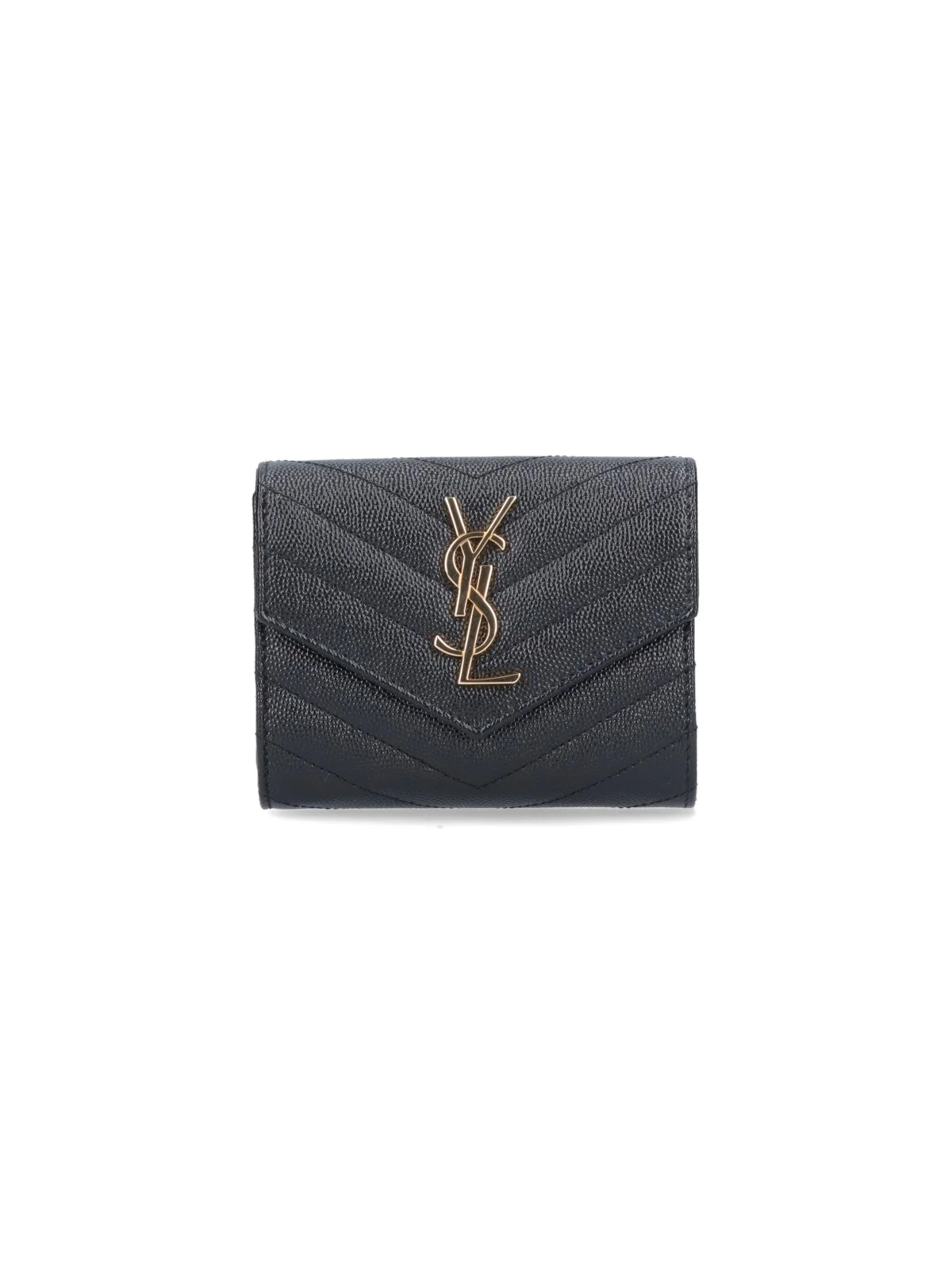 SAINT LAURENT 'CASSANDRE' TRI-FOLD WALLET, TRI-FOLD WALLET "CASSANDRE" SAINT LAURENT, EMBOSSED LEATHER, BLACK COLOUR, SNAP BUTTON CLOSURE, GOLD COLOUR FRONT LOGO, ONE FLAT BACK POCKET, ONE INTERNAL BANKNOTE COMPARTMENT, ONE INTERNAL ZIPPED COIN POCKET, SIX CARD SLOTS, GOLD COLOUR LETTERING LOGO DETAIL. PRODUCT INFO PRODUCT CODE 403943 BOW011000 MADE IN: ITALY - 100% LEATHER - H 10 X W 12.5 X D 2.5 CM