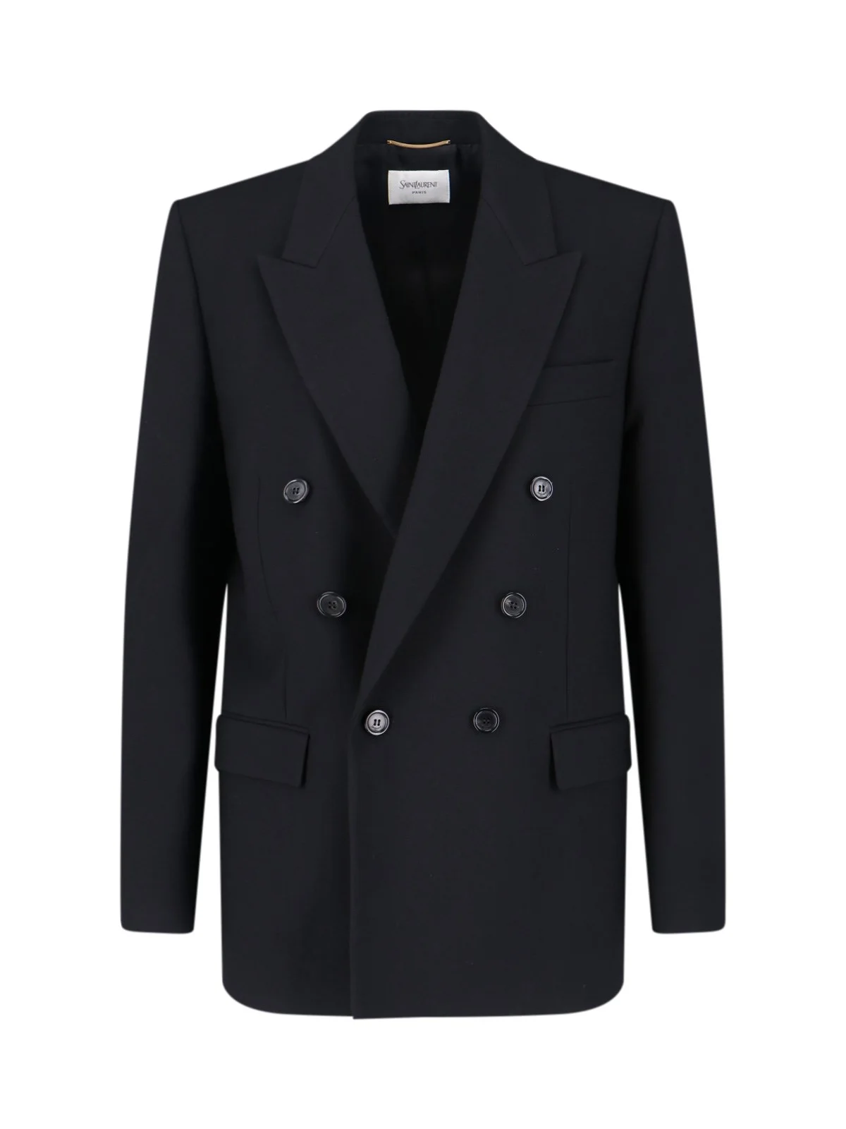 SAINT LAURENT DOUBLE-BREASTED "CASSANDRE" BLAZER IN BLACK WOOL WITH PEAK LAPELS, BUTTON CLOSURE, CHEST POCKET, TWO SIDE POCKETS, BUTTON CUFFS, BACK SLIT DETAIL, STRAIGHT HEM. PRODUCT INFO PRODUCT CODE 843367 Y7B731000 COMPOSITION: 100% WOOL SIZE AND FIT: REGULAR FIT MADE IN: ITALY