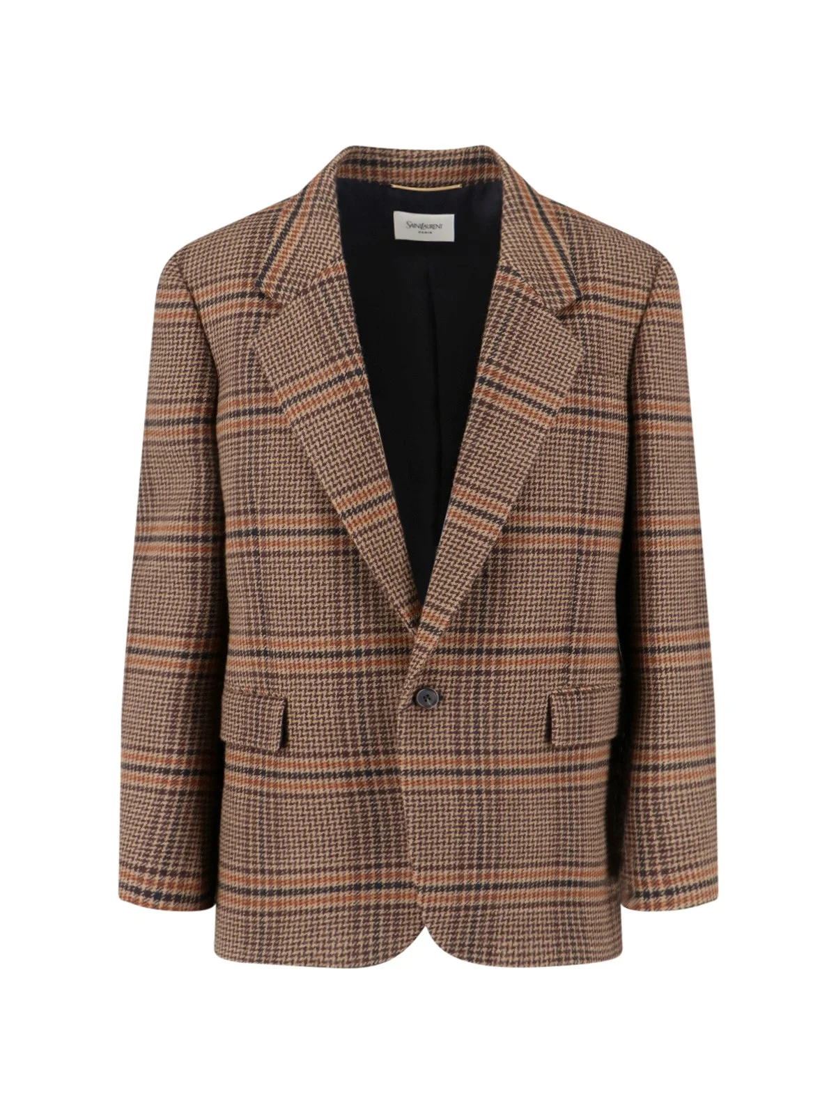 SAINT LAURENT WOOL HOUNDSTOOTH BLAZER IN BROWN, CLASSIC LAPELS, SINGLE-BUTTON CLOSURE, TWO SIDE FLAP POCKETS, BUTTON CUFFS, SLIT BUTTONS AT THE BACK HEM, STRAIGHT HEM. PRODUCT INFO PRODUCT CODE 842593 Y9I702849 COMPOSITION: 100% WOOL SIZE AND FIT: REGULAR FIT MADE IN: ITALY