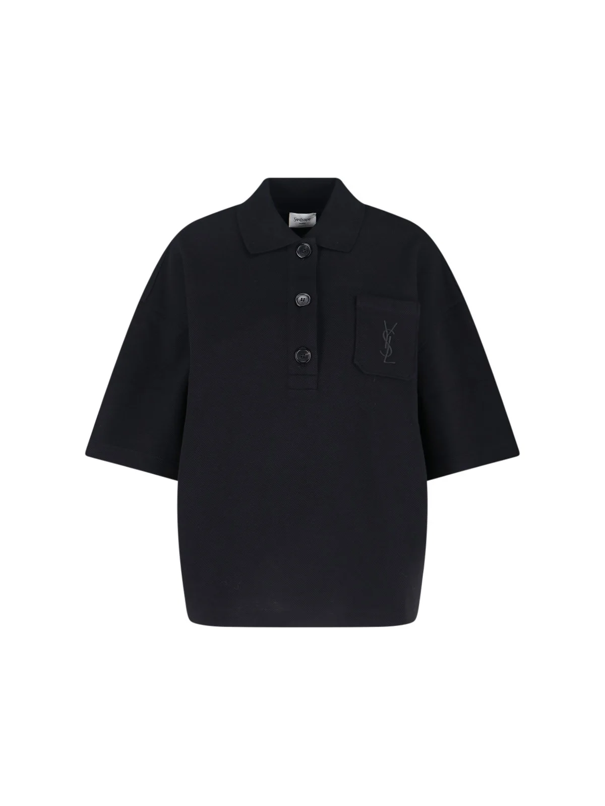 SAINT LAURENT "CASSANDRE" BLACK COTTON POLO SHIRT WITH CLASSIC COLLAR, BUTTON CLOSURE, DROPPED SHOULDERS, FRONT POCKET, TONE-ON-TONE EMBROIDERED CASSANDRE LOGO DETAIL, STRAIGHT HEM. PRODUCT INFO PRODUCT CODE 848941 Y38BN1000 COMPOSITION: 100% COTTON SIZE AND FIT: OVERSIZED FIT MADE IN: ITALY