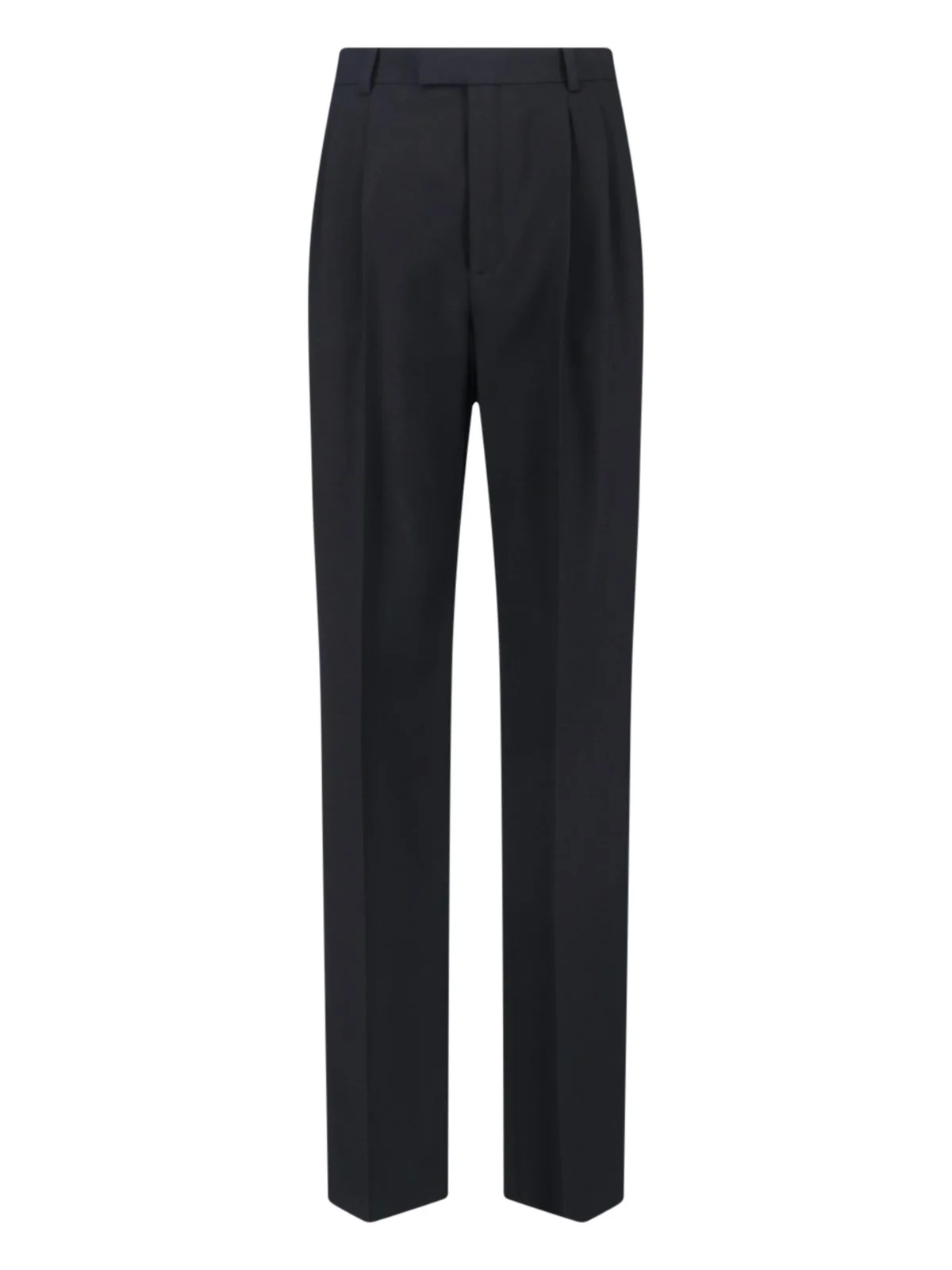 SAINT LAURENT BLACK WOOL PANTS WITH HIGH WAIST, BELT LOOPS, HOOK AND ZIP CLOSURE, FRONT PLEATED DETAIL, TWO SIDE POCKETS, TWO BACK BUTTON POCKETS, STRAIGHT LEG. PRODUCT INFO PRODUCT CODE 837054 Y7B731000 COMPOSITION: 100% WOOL SIZE AND FIT: REGULAR FIT MADE IN: ITALY