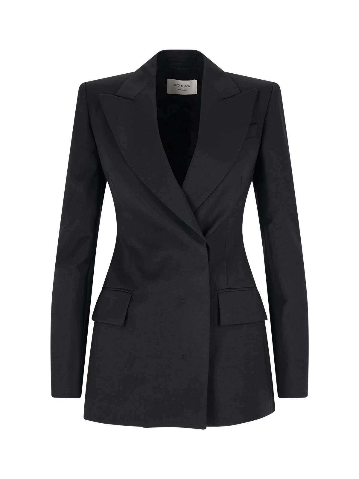SPORTMAX 'DANZICA' DOUBLE-BREASTED BLAZER IN BLACK VIRGIN WOOL WITH PEAK LAPELS, DOUBLE-BREASTED CONCEALED BUTTON CLOSURE AT THE FRONT, LIGHT SLEEVES, TWO FRONT FLAP POCKETS, BUTTONS ON THE CUFFS, STRAIGHT HEM. PRODUCT INFO PRODUCT CODE 2612041011600004 COMPOSITION: 100% VIRGIN WOOL SIZE AND FIT: REGULAR FIT MADE IN: ITALY