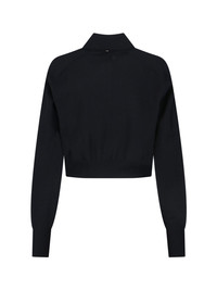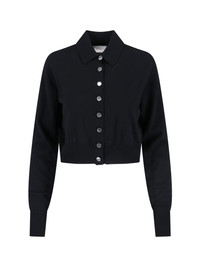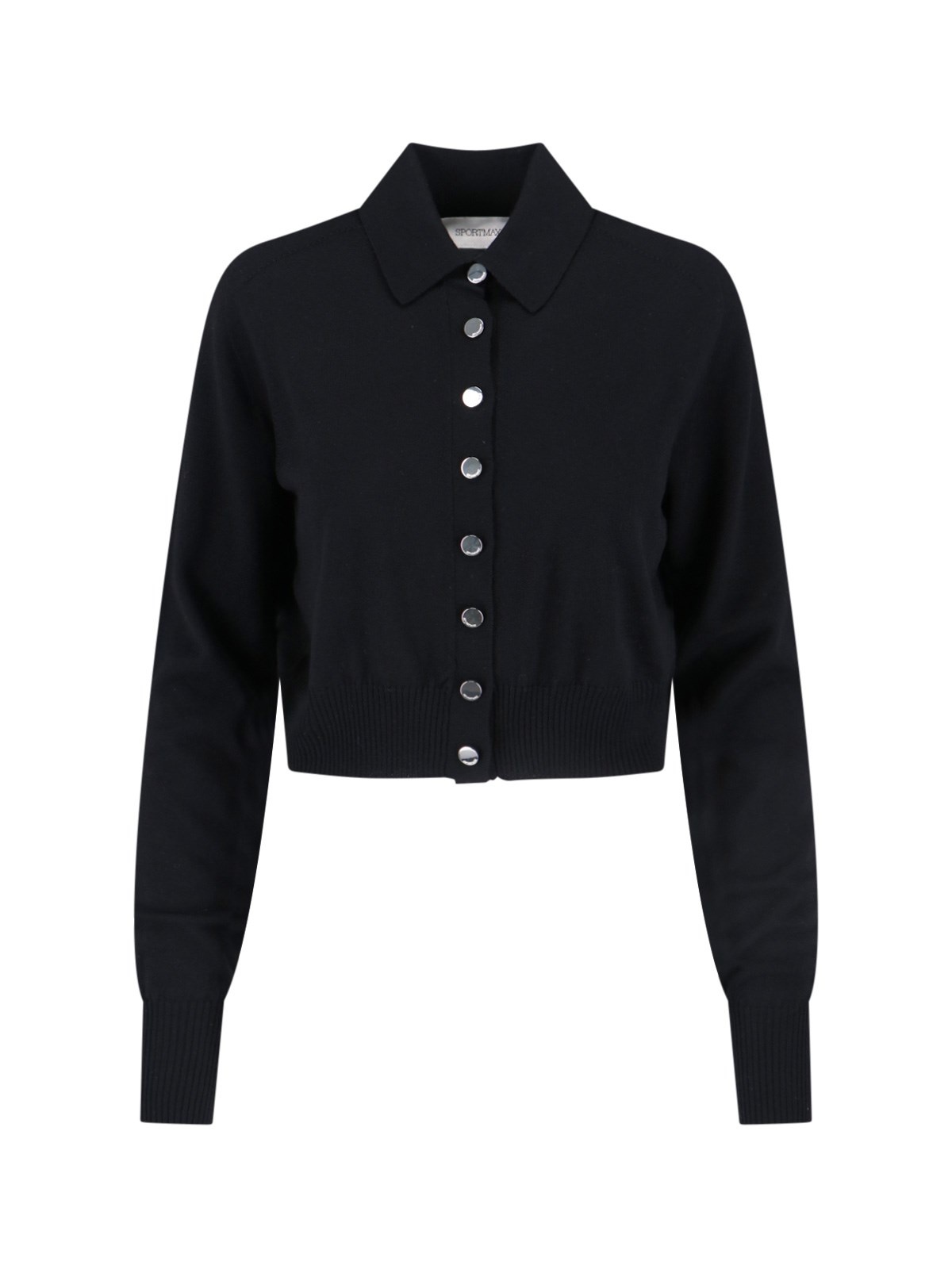 SPORTMAX BLACK VIRGIN WOOL CARDIGAN WITH CLASSIC COLLAR, BUTTON CLOSURE, BACK LOGO CHARM, RIBBED TRIMS, STRAIGHT HEM. PRODUCT INFO PRODUCT CODE 2522346011600001 COMPOSITION: 100% VIRGIN WOOL SIZE AND FIT: REGULAR FIT MADE IN: ROMANIA