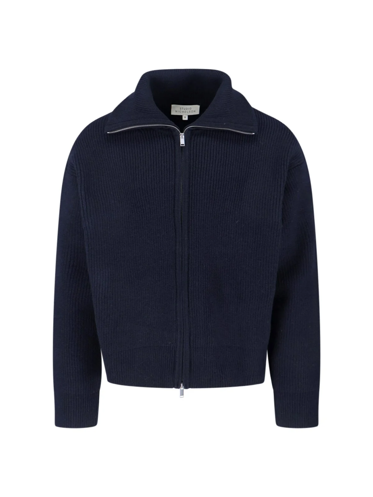 STUDIO NICHOLSON 'SANDOS' ZIP SWEATER IN NAVY EXTRAFINE BLUE MERINO WOOL WITH RIBBED PATTERN, COLLAR, DOUBLE ZIP CLOSURE, CUT-OUT DETAIL ON CUFFS, STRAIGHT HEM. PRODUCT INFO PRODUCT CODE SANDOS SN 1497DARKEST NAVY COMPOSITION: 100% EXTRAFINE MERINO WOOL SIZE AND FIT: REGULAR FIT MADE IN: CHINA