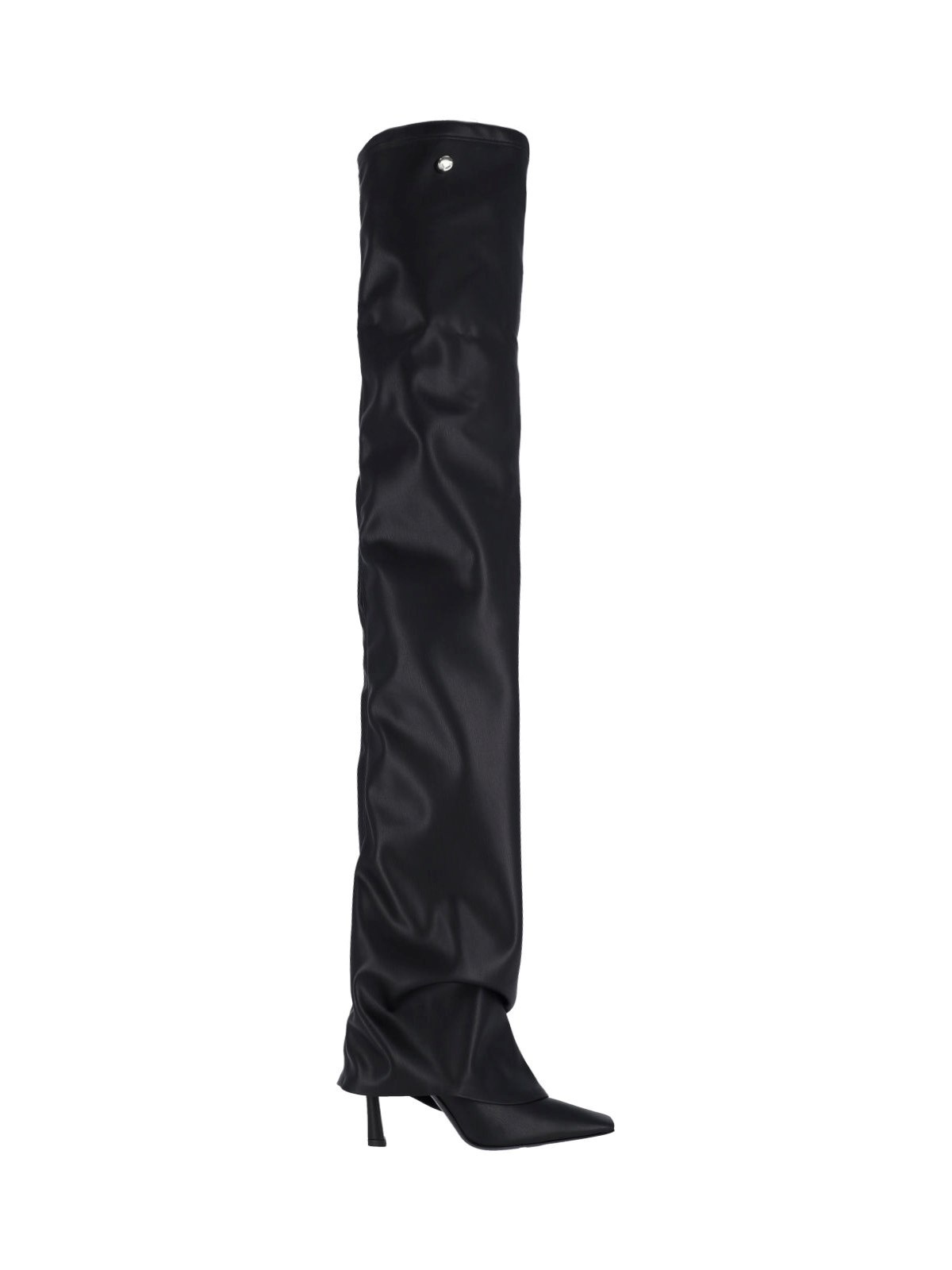 THE ATTICO 'ROBIN OTK' HIGH BOOTS IN BLACK FAUX LEATHER WITH POINTED TOE, SLIP-ON FIT, SQUARE HEEL, LEATHER SOLE. PRODUCT INFO PRODUCT CODE 250WSH00872 PUR003AA100 COMPOSITION: 55% POLYURETHANE, 45% POLYESTER SIZE AND FIT: HEEL 9.5 CM MADE IN: ITALY - SOLE: 100% LEATHER
