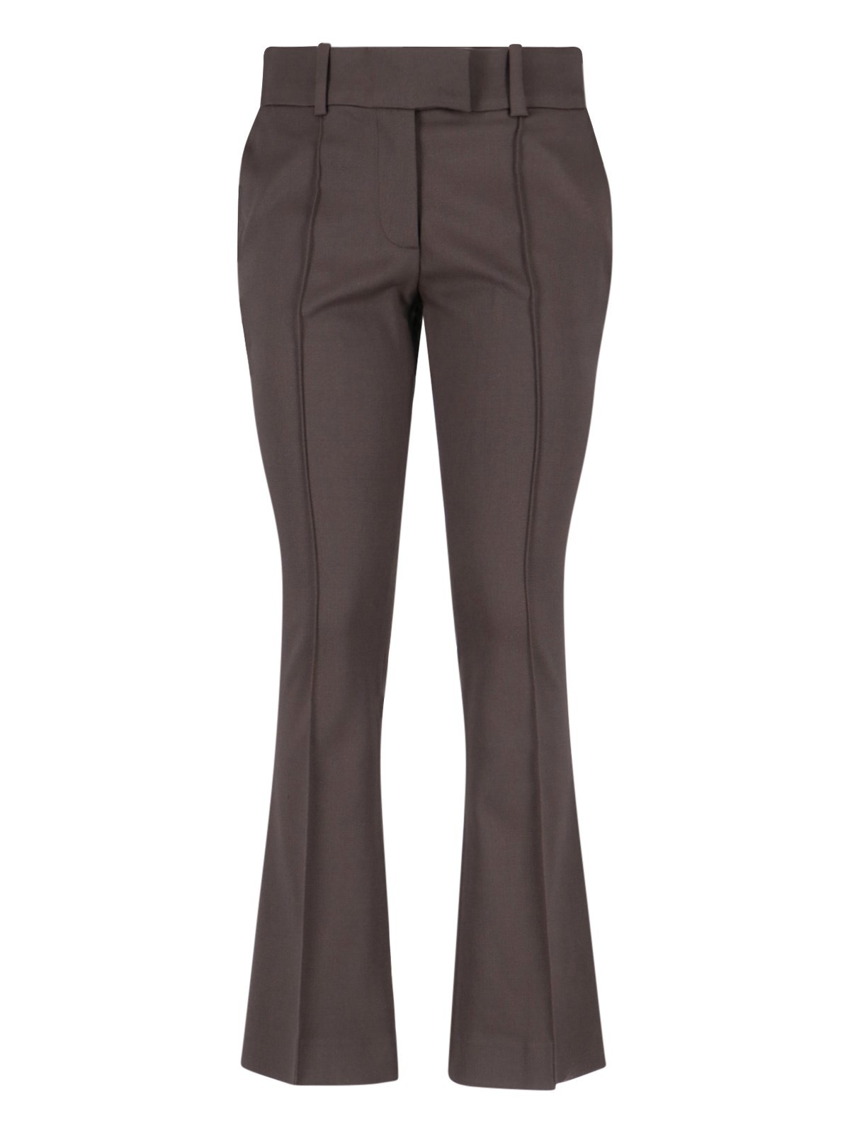 THE ATTICO VIRGIN WOOL BOOTCUT TROUSERS, BROWN, HIGH WAIST, BELT LOOPS, HOOK AND ZIP CLOSURE, TWO SIDE POCKETS, TWO BACK WELT POCKETS, SILVER METAL LOGO TAG DETAIL, STRAIGHT LEG. PRODUCT INFO PRODUCT CODE 251WCP00266 WWW061AA064 COMPOSITION: 98% VIRGIN WOOL, 2% ELASTANE SIZE AND FIT: REGULAR FIT MADE IN: ITALY